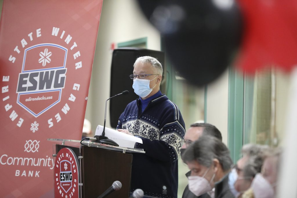 A panel of guests, including sponsors and athletes, speak to the media during the Empire State Winter Games press event at the Tupper Lake Civic Center in Tupper Lake, New York, on Tuesday, January 11, 2022. Photo by Kayla Breen.