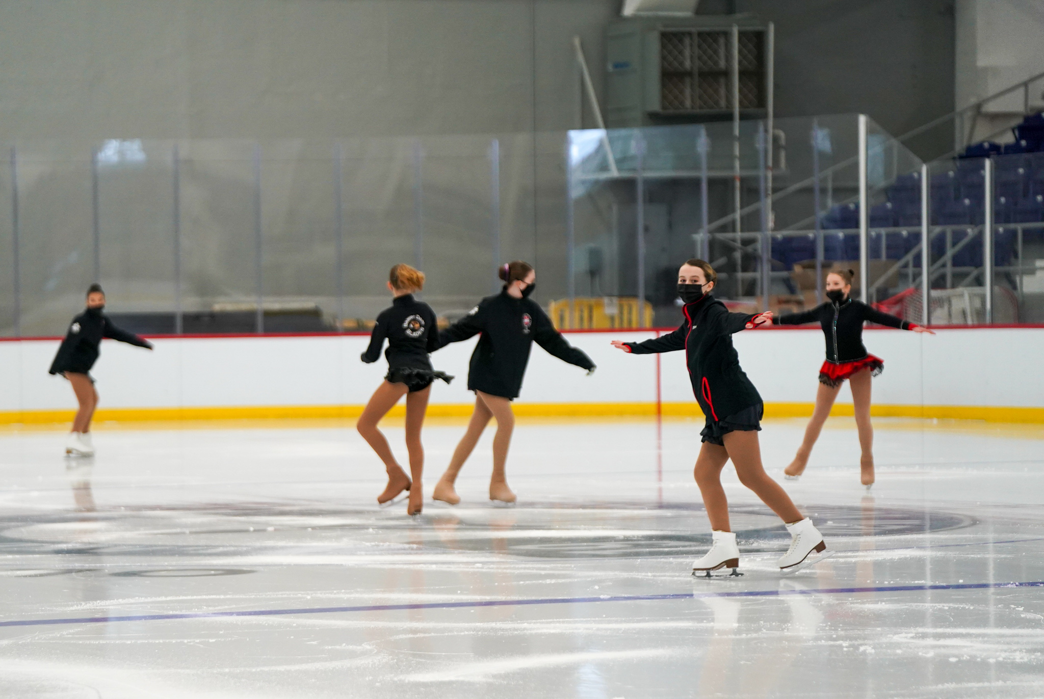 The Beginner Girls Excel figure skaters practice in the 1932 ice rink before competing in the Olympic Center during the Empire State Winter Games in Lake Placid, NY on Saturday, February 5, 2022. (Photo by Emma Vallelunga/Newhouse School)