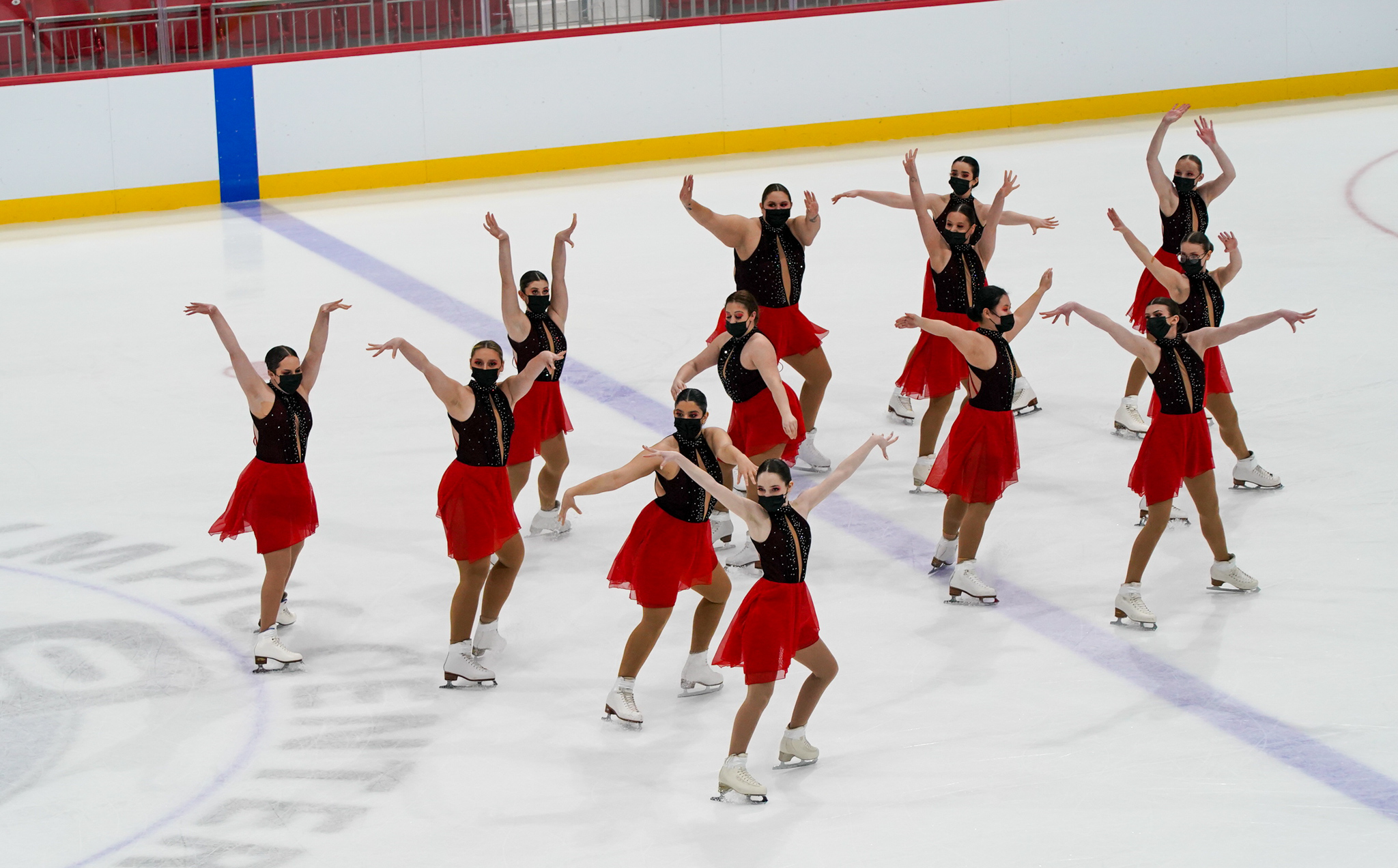 The Orange Experience from Syracuse University figure skates on the 1980 ice rink in the Olympic Center during the Empire State Winter Games in Lake Placid, NY on Saturday, February 5, 2022. (Photo by Emma Vallelunga/Newhouse School)