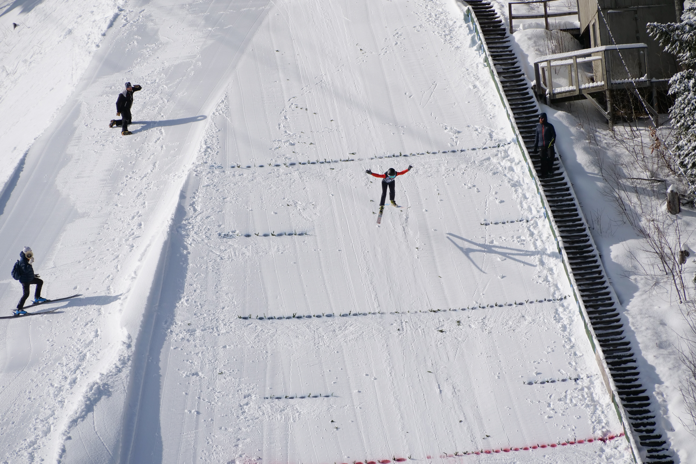 Eli Larkin competing in the K48 ski jump at the Empire State Winter Games on February 5th, 2022. (Photo by Cole Strong/Newhouse School)