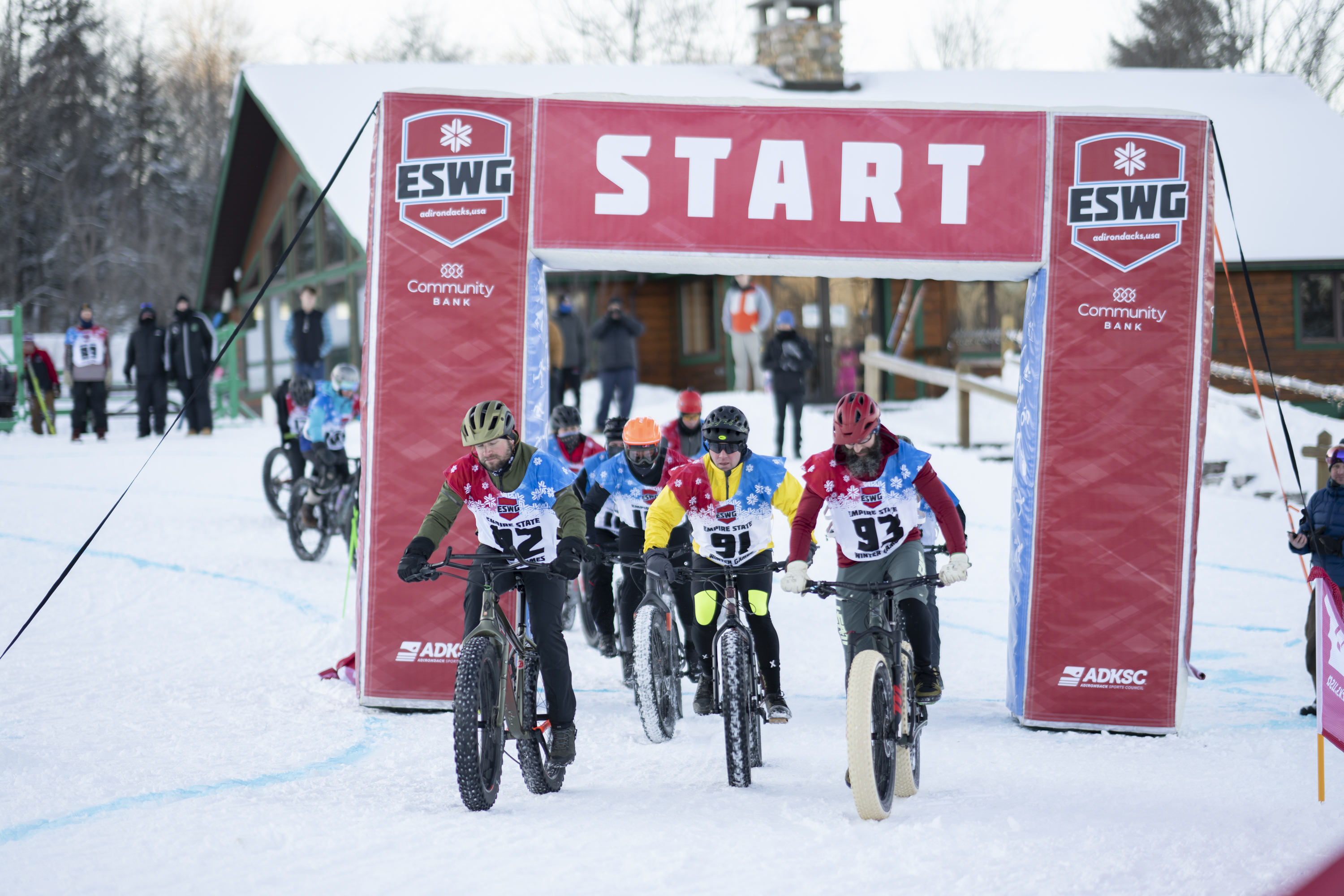 Bicyclists take off from the starting line during the Empire State Winter Games Cross-Country Biking 5K race at Mt. Pisgah on Saturday, February 5, 2022. (Photo by Kayla Breen/Newhouse School)