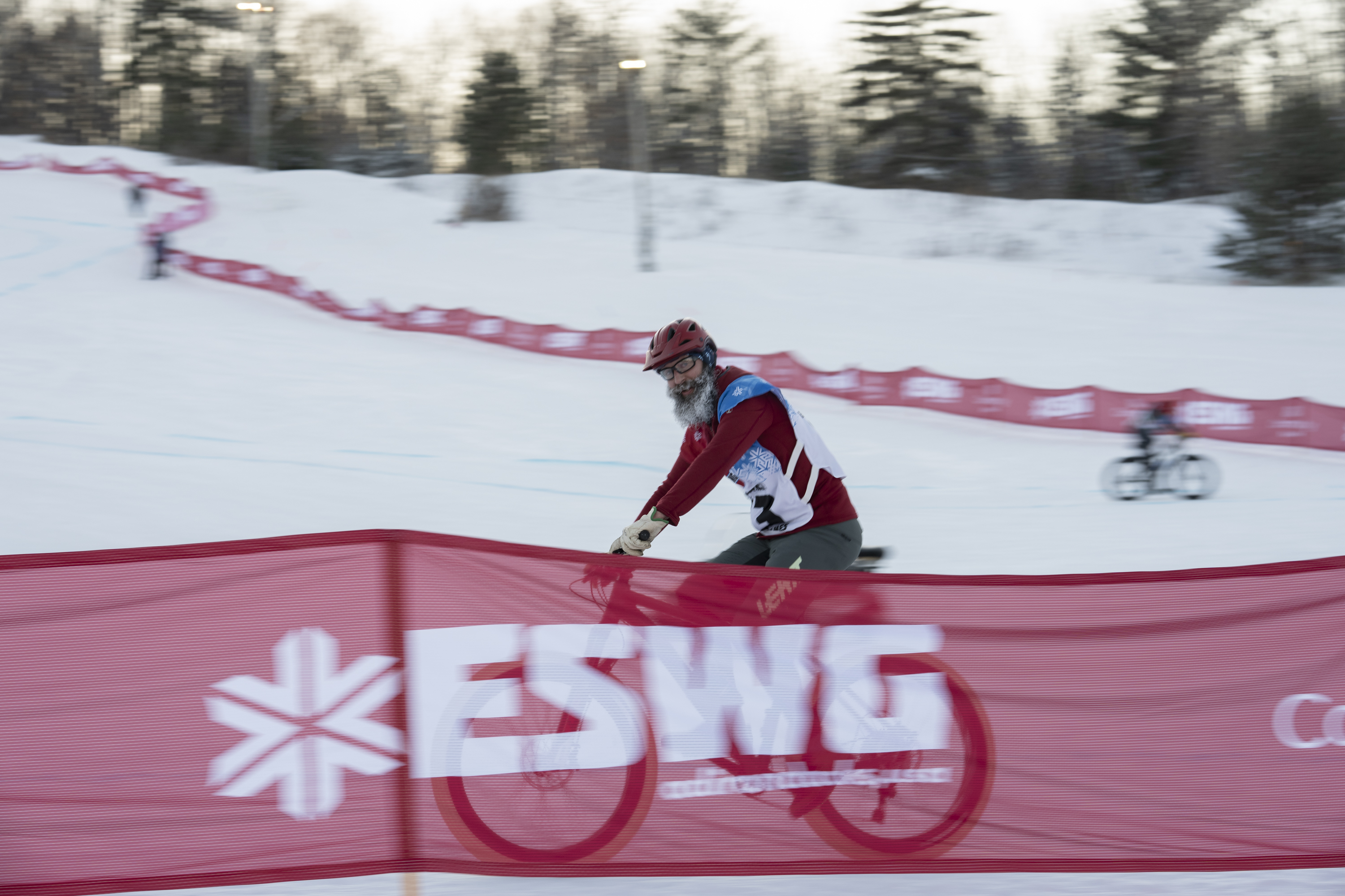 Patrick Robinson of Ringwood, N.J., smiles at the camera after completing his second lap during the Empire State Winter Games Cross-Country Biking 5K race at Mt. Pisgah on Saturday, February 5, 2022. (Photo by Kayla Breen/Newhouse School)