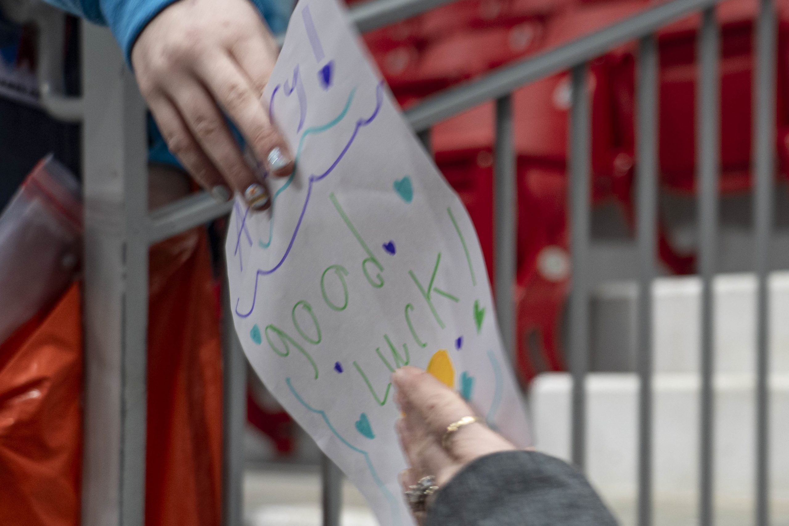 A little girl draws on a white board while waiting for the figure skating medal ceremony to begin during the Empire State Winter Games at the Olympic Center in Lake Placid, New York, on Wednesday, January 31, 2024. (Photo by Diana Valdivia/Newhouse School)