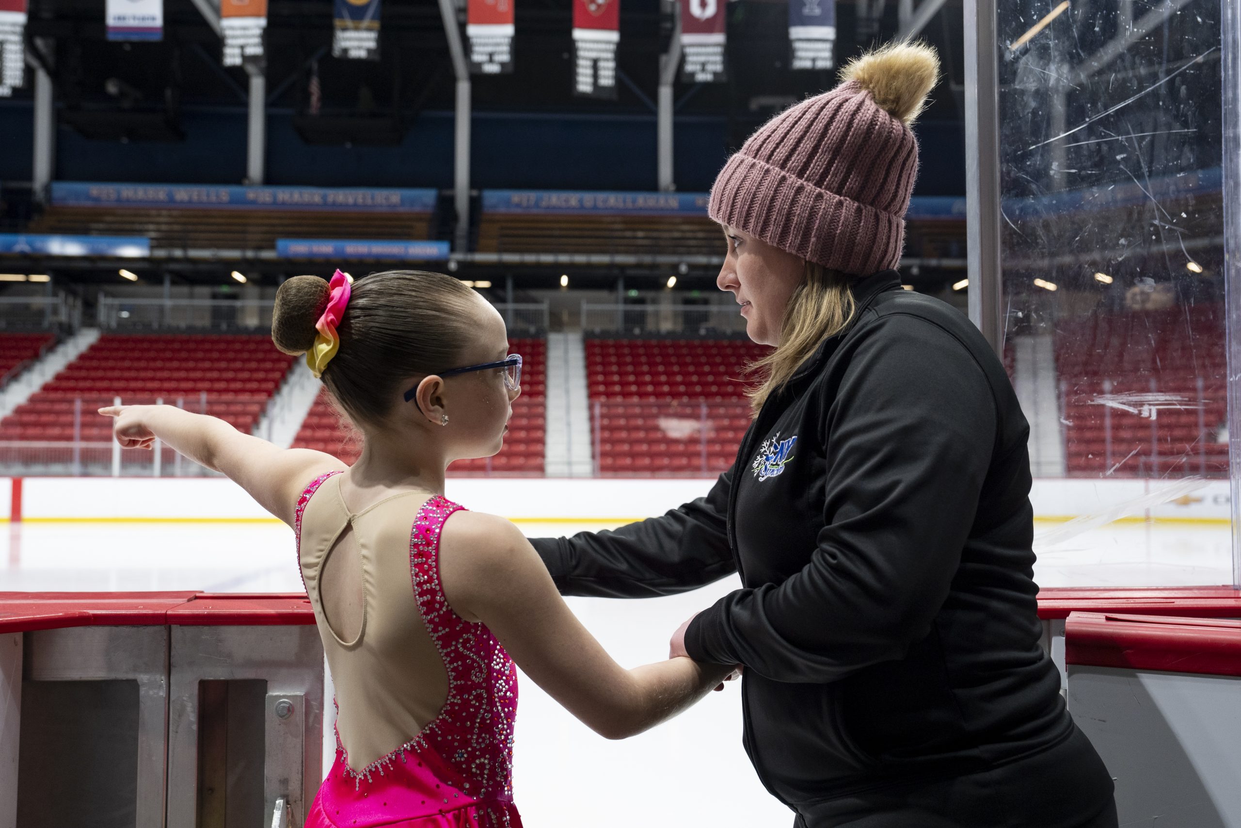 Athlete Sophia Ferrieri and her coach, Yesenia Naranjo, do some last-minute run-throughs before taking the ice during the Empire State Winter Games at the Olympic Center in Lake Placid, New York, on Wednesday, January 31, 2024. (Photo by Diana Valdivia/Newhouse School)