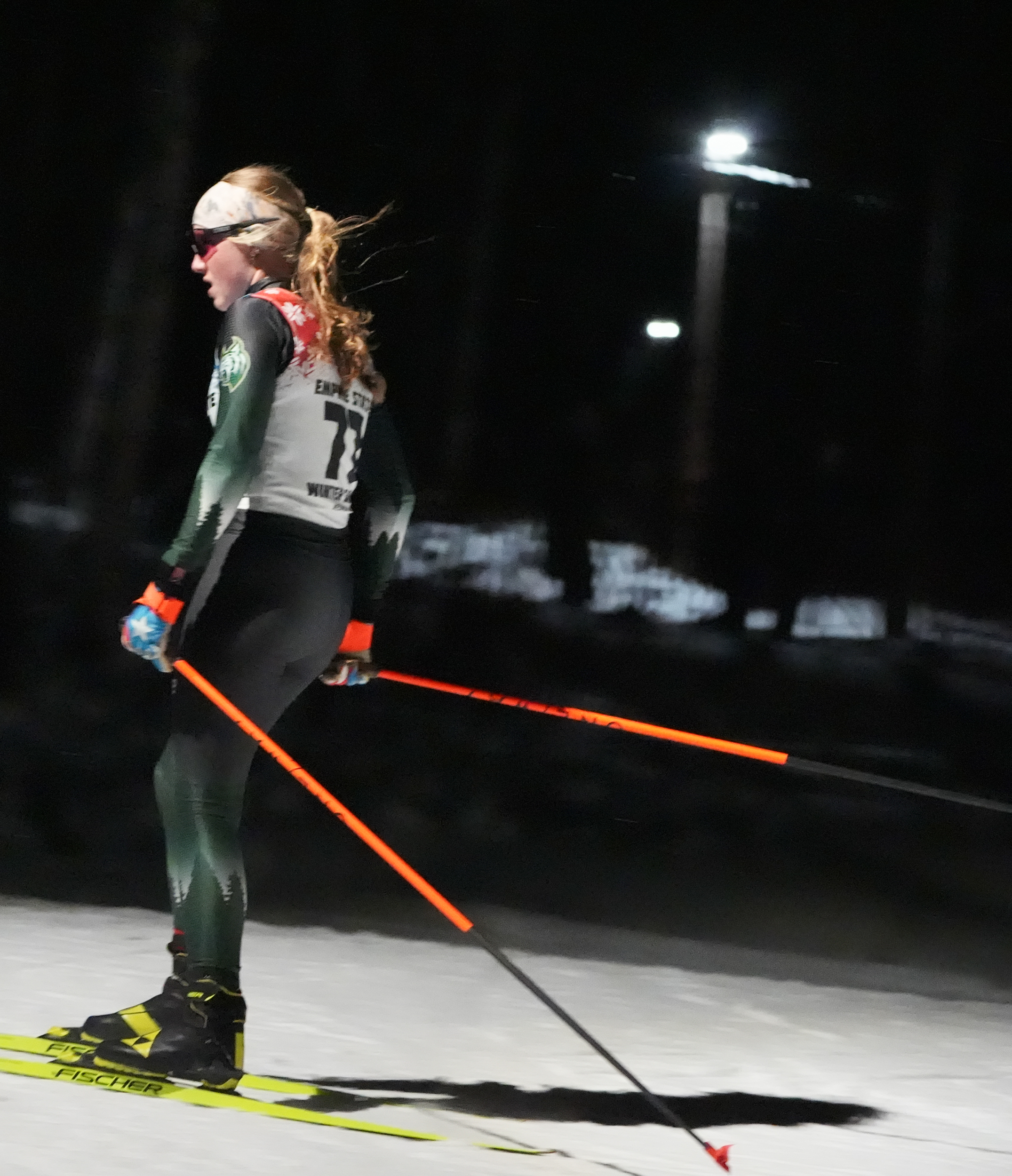 February 7, 2026#77 Cora Hinsdill in the cross country ski 2.5K Freestyle Female U18 category passing the finish line at the 2026 Empire State Winter Games Opening Ceremony Dewey Mountain Recreation Center in Saranac Lake, New York, on Feb 6, 2026. (Cassie Roshu/The Newhouse School)
