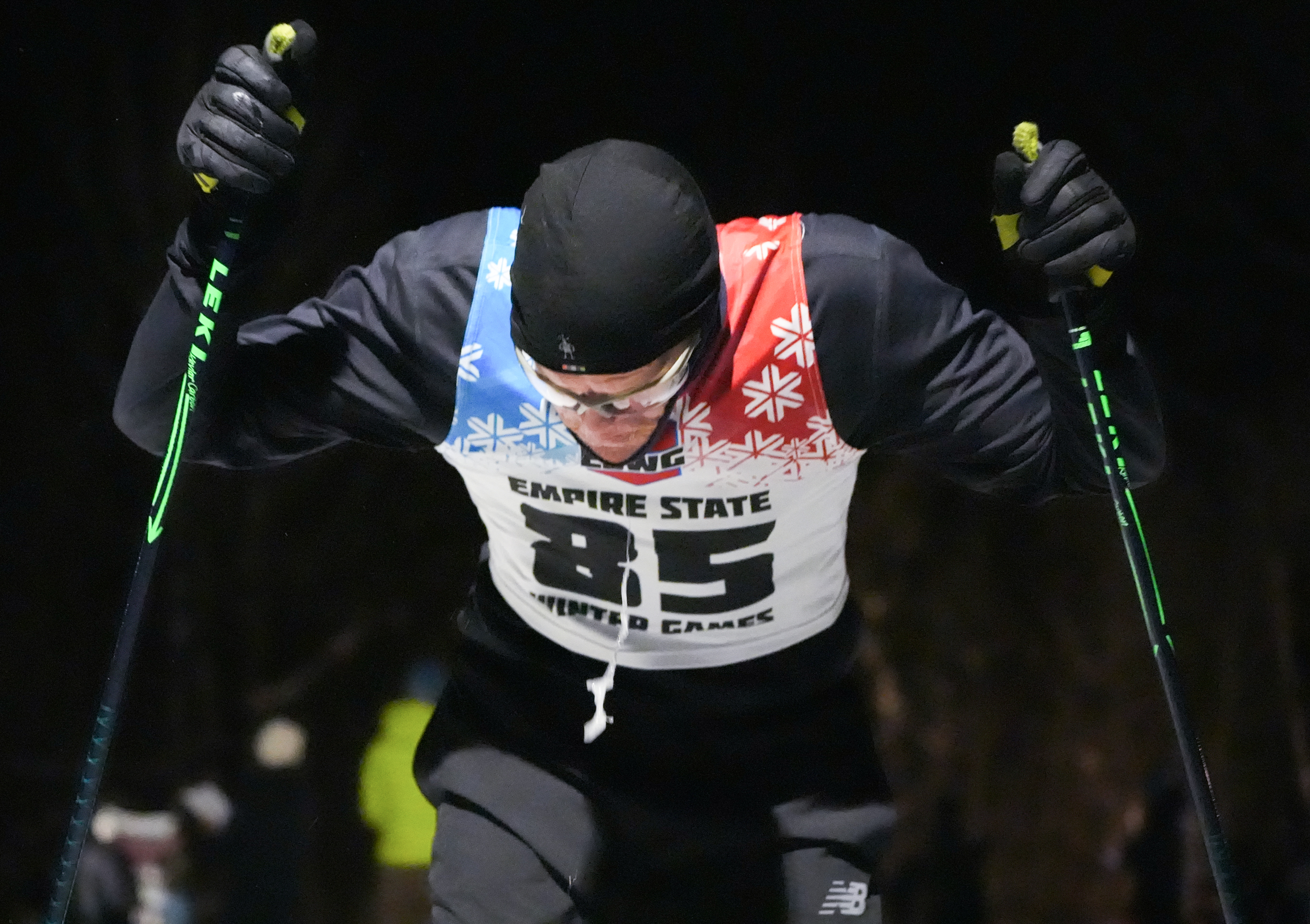 #85 Chris Wilkins in the cross country ski 2.5K Freestyle Masters Male category passing the finish line at the 2026 Empire State Winter Games Opening Ceremony Dewey Mountain Recreation Center in Saranac Lake, New York, on Feb 6, 2026. (Cassie Roshu/The Newhouse School)