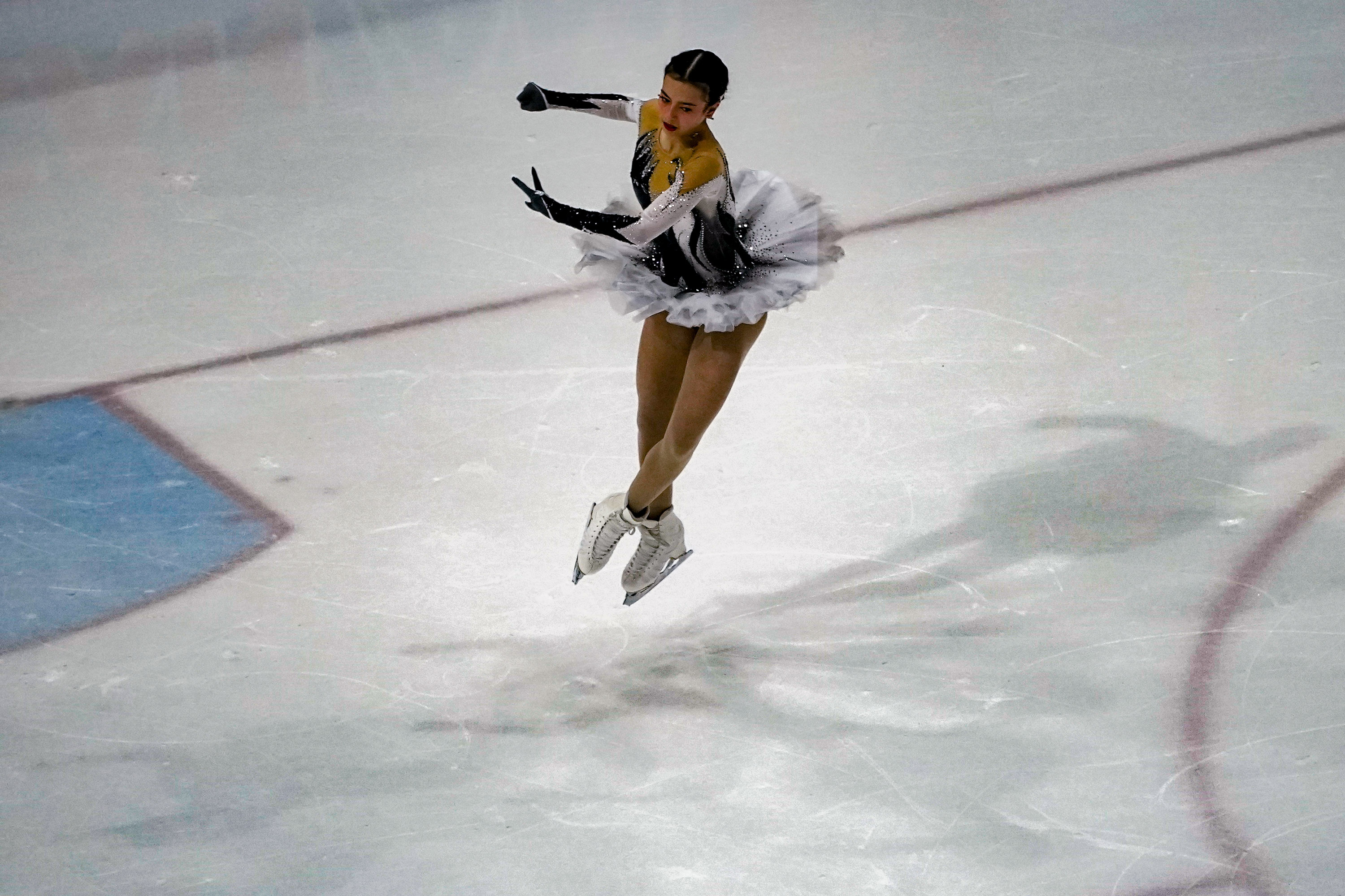 Caroline Canary of the Hudson-Mohawk Figure Skating Club spins through the air during the Empire State Winter Games at the 1980 Arena in the Olympic Center on Friday, February 6, in Lake Placid, New York. (Jack Henry/The Newhouse School)
