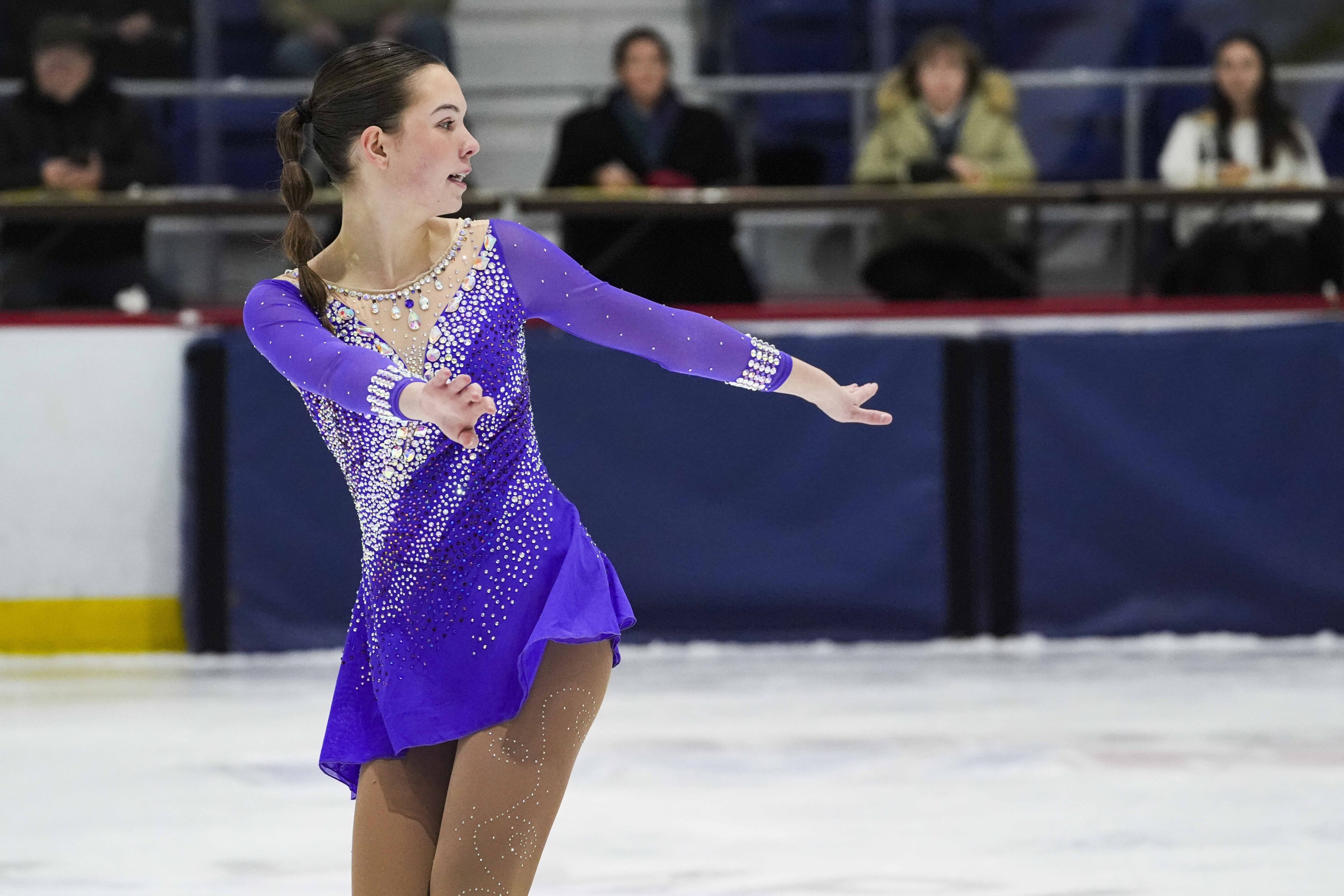 Madelyn Vance, an ice skater from Skaneatles, New York, performs her routine for a panel of judges during the 2026 Empire State Winter Games Ice Skating Competitions in the 1980 Rink at the Olympic Center in Lake Placid, New York, on Feb. 6, 2026. (Alexa Hernandez/The Newhouse School)