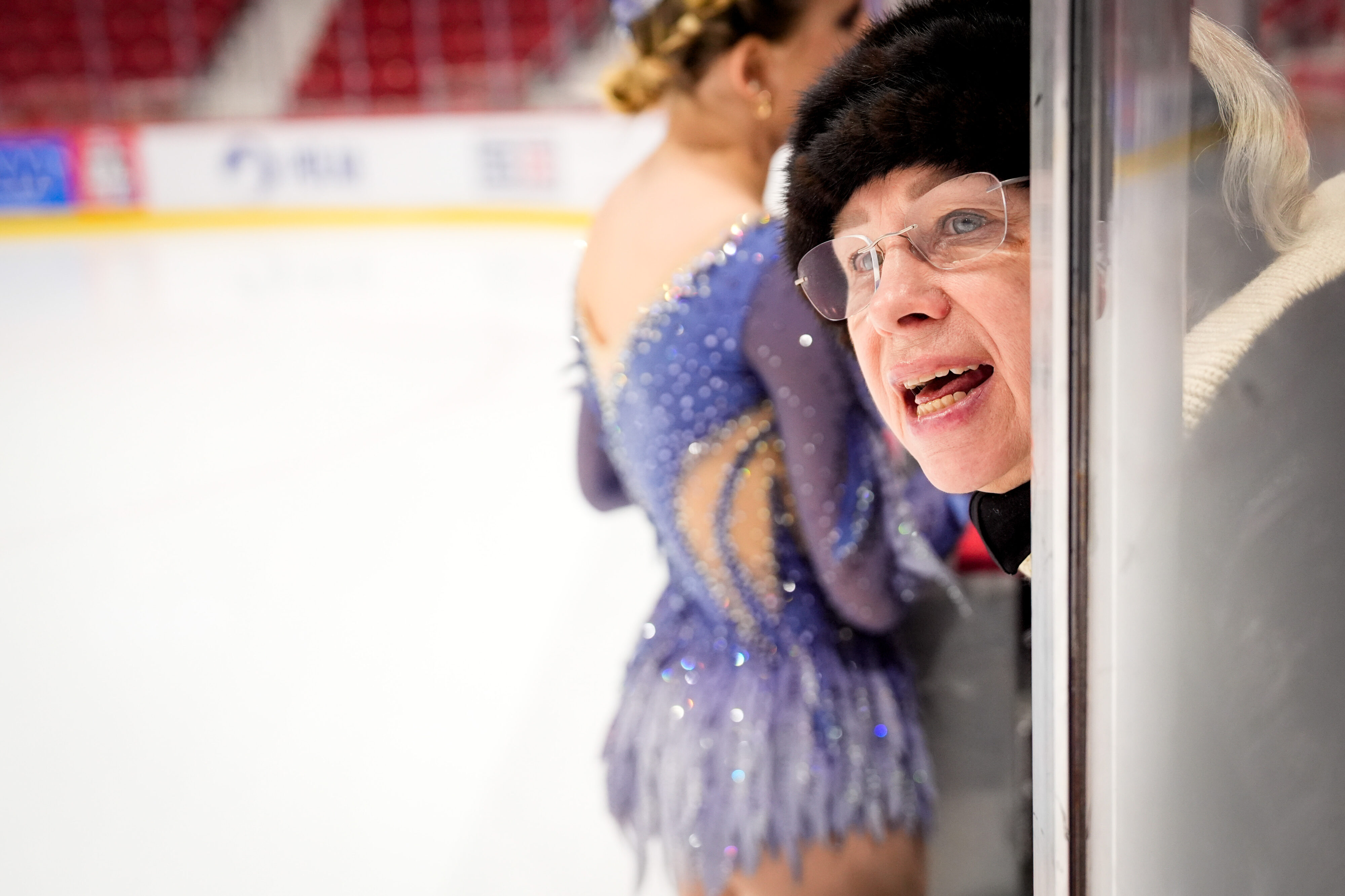 February 7, 2026Coaches speak to the skaters as they warm up. Scene from figure skating performances at the 1980 Rink on Friday, February 6 in Lake Placid, NY. (Collin Snyder/The Newhouse School)