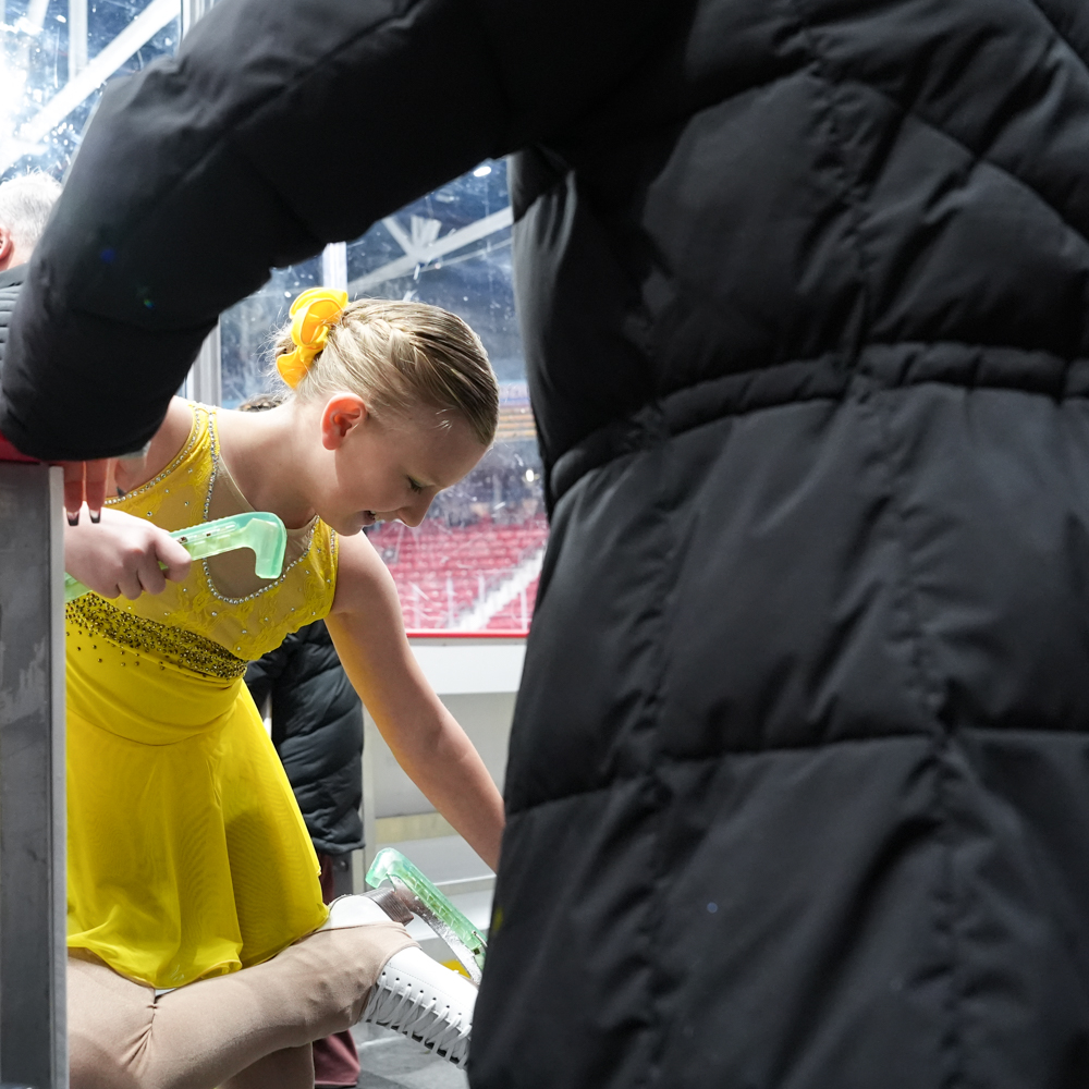 A skater puts the covers on her skate blades after her performance at the Empire State Winter Games at the 1980 Rink at the Olympic Complex in Lake Placid, NY, on Feb 7, 2026. (Adeline Taylor/ Newhouse School.)