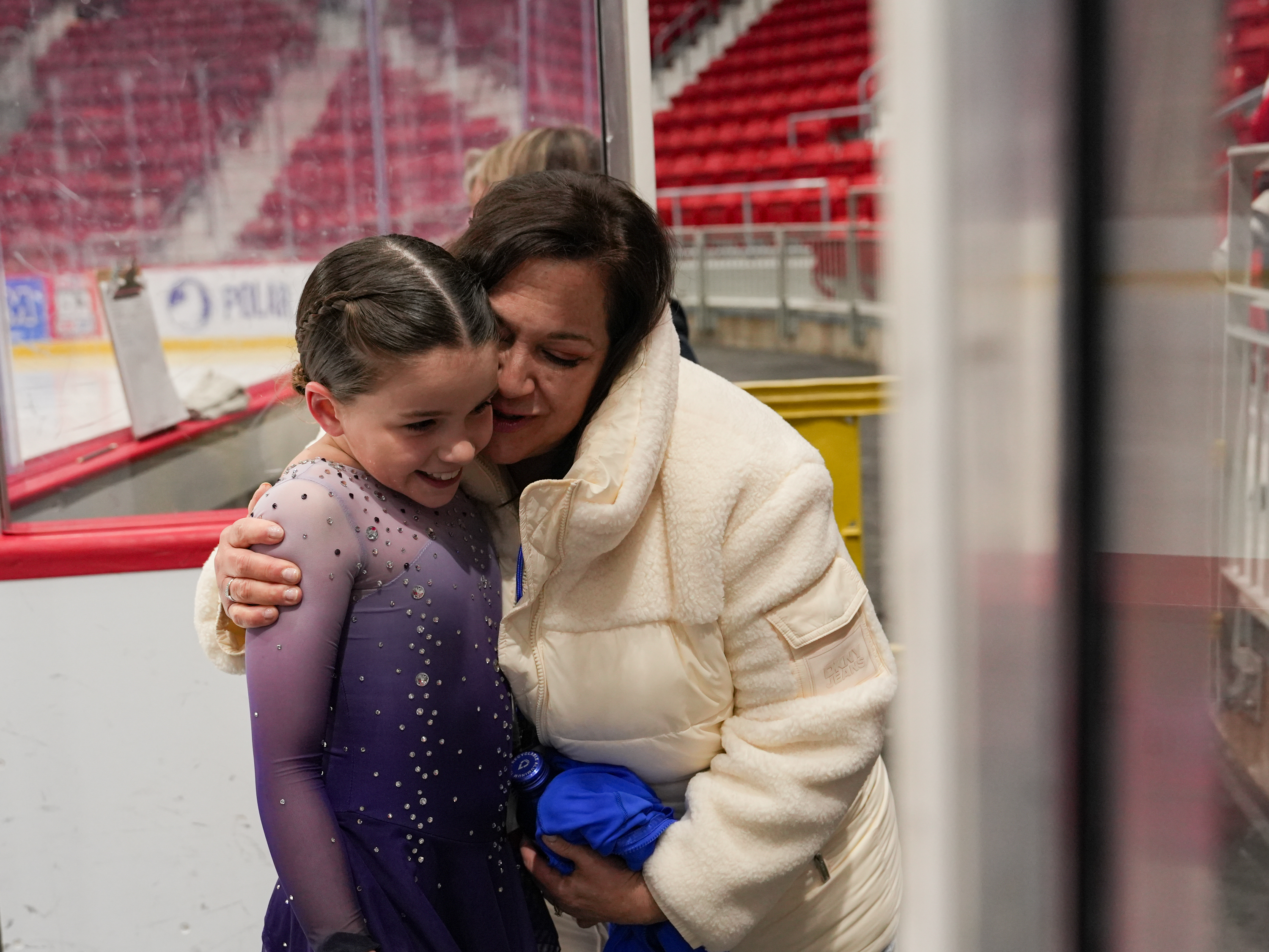 Charlotte Bentley of Hudson-Mohawk FSC hugs her coach after she successfully finishes her routine on the ice at the 2026 Empire State Winter Games in the 1980 Rink at the Olympic Complex in Lake Placid, New York, on Feb 6, 2026. (Rebecca Beckas/The Newhouse School)