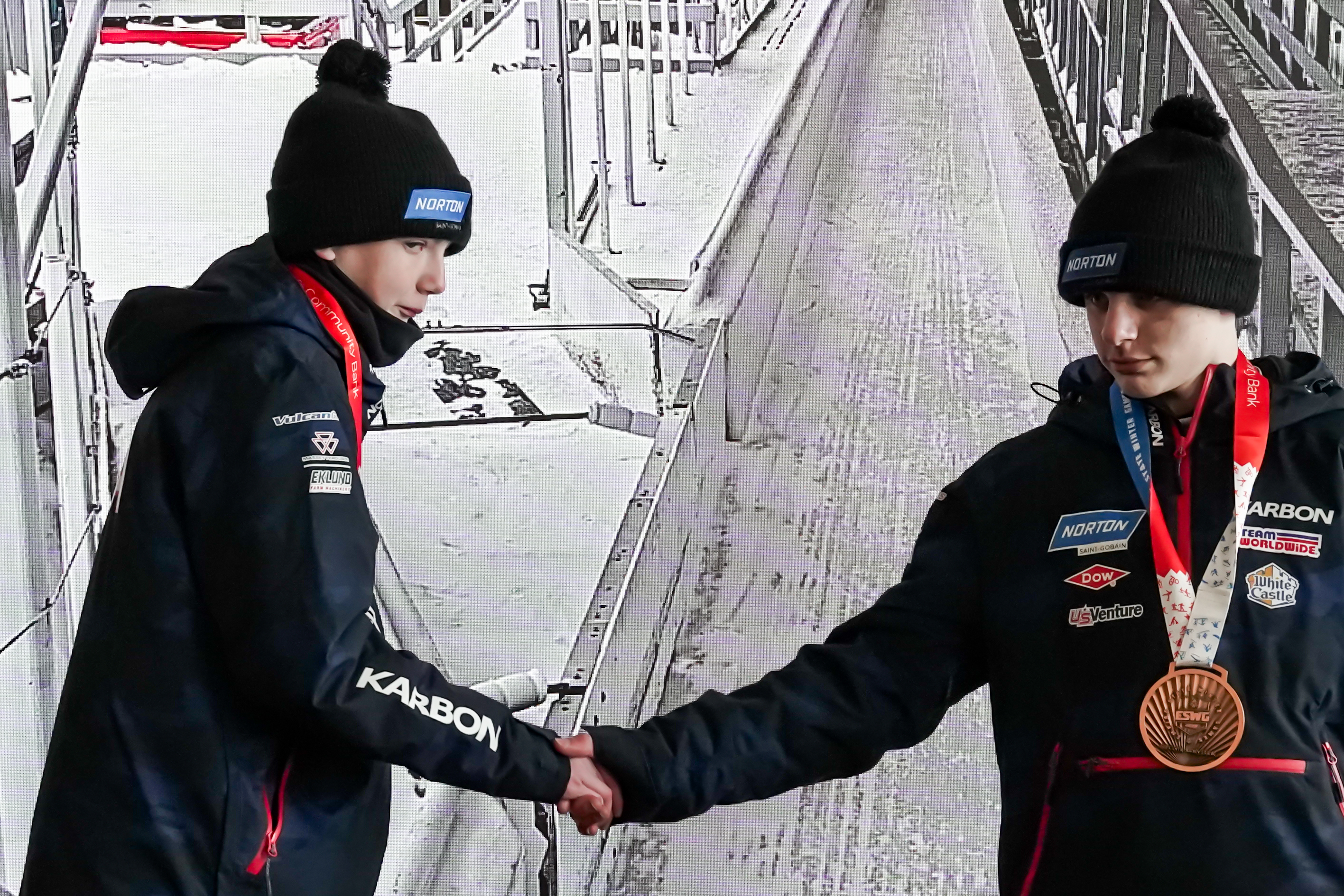 February 7, 2026Luge medalists William Roberts (silver) and Samuel Hazel (bronze) shake hands on the podium on Mt. Van Hoevenberg in Lake Placid, New York during the Empire State Winter Games on Saturday, Feb. 7, 2026. (Jack Henry / Newhouse School)