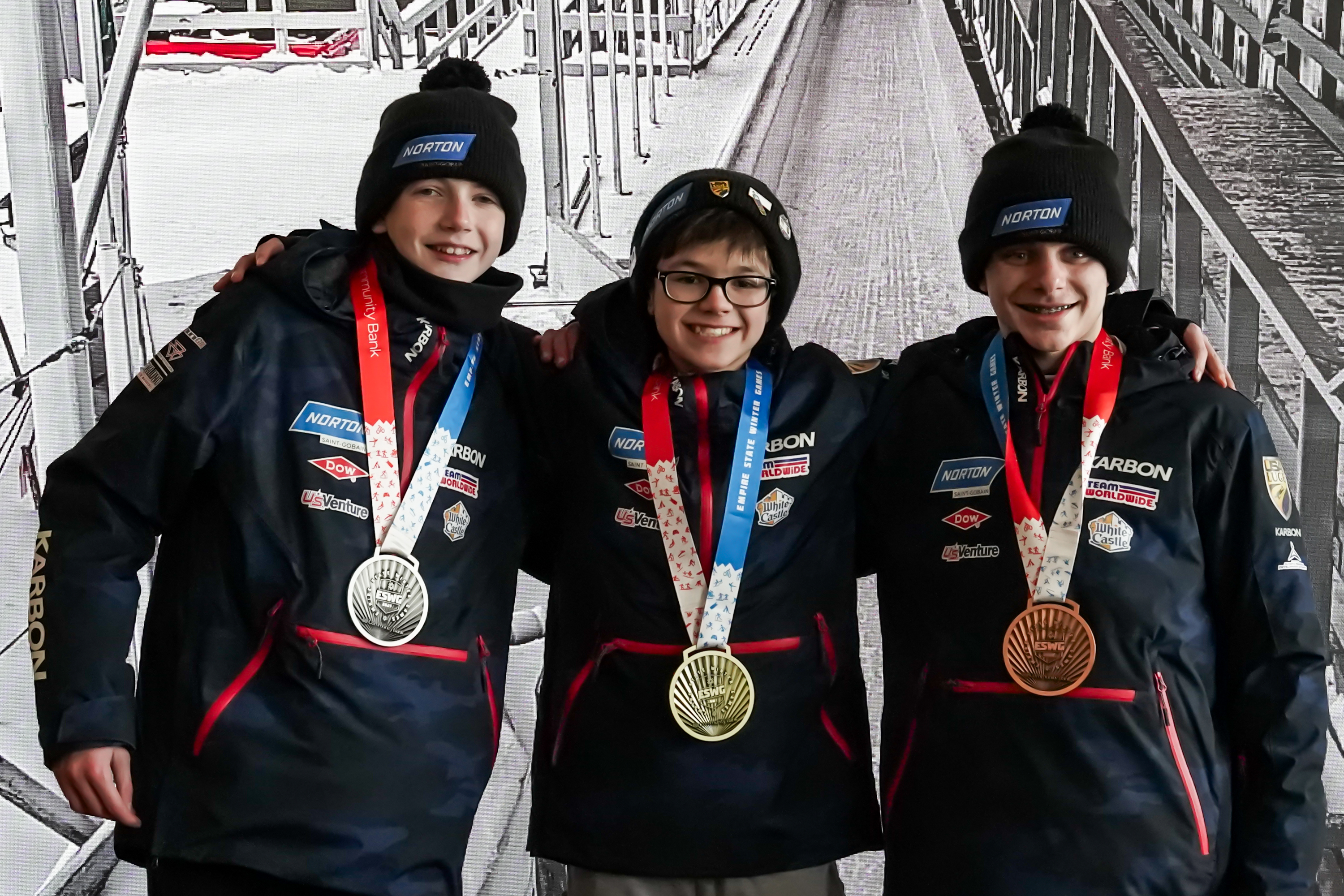 Luge medalists Maxim Zayonc (gold), William Roberts (silver), and Samuel Hazel (bronze) receive their medals on Mt. Van Hoevenberg in Lake Placid, New York during the Empire State Winter Games on Saturday, Feb. 7, 2026. (Jack Henry / Newhouse School)
