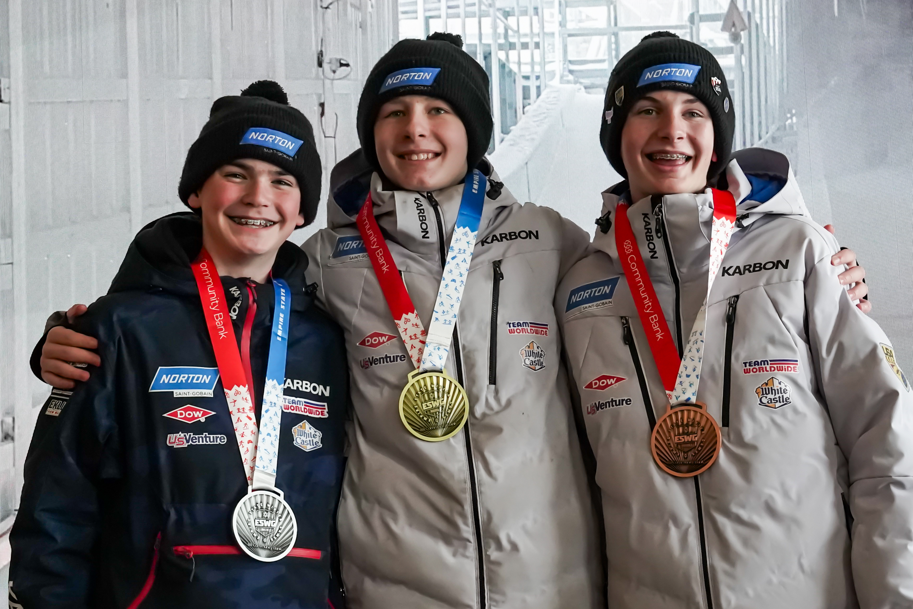 February 7, 2026Luge medalists Maxim Zayonc (gold), William Roberts (silver), and Samuel Hazell (bronze) receive their medals on Mt. Van Hoevenberg in Lake Placid, New York during the Empire State Winter Games on Saturday, Feb. 7, 2026. (Jack Henry / Newhouse School)
