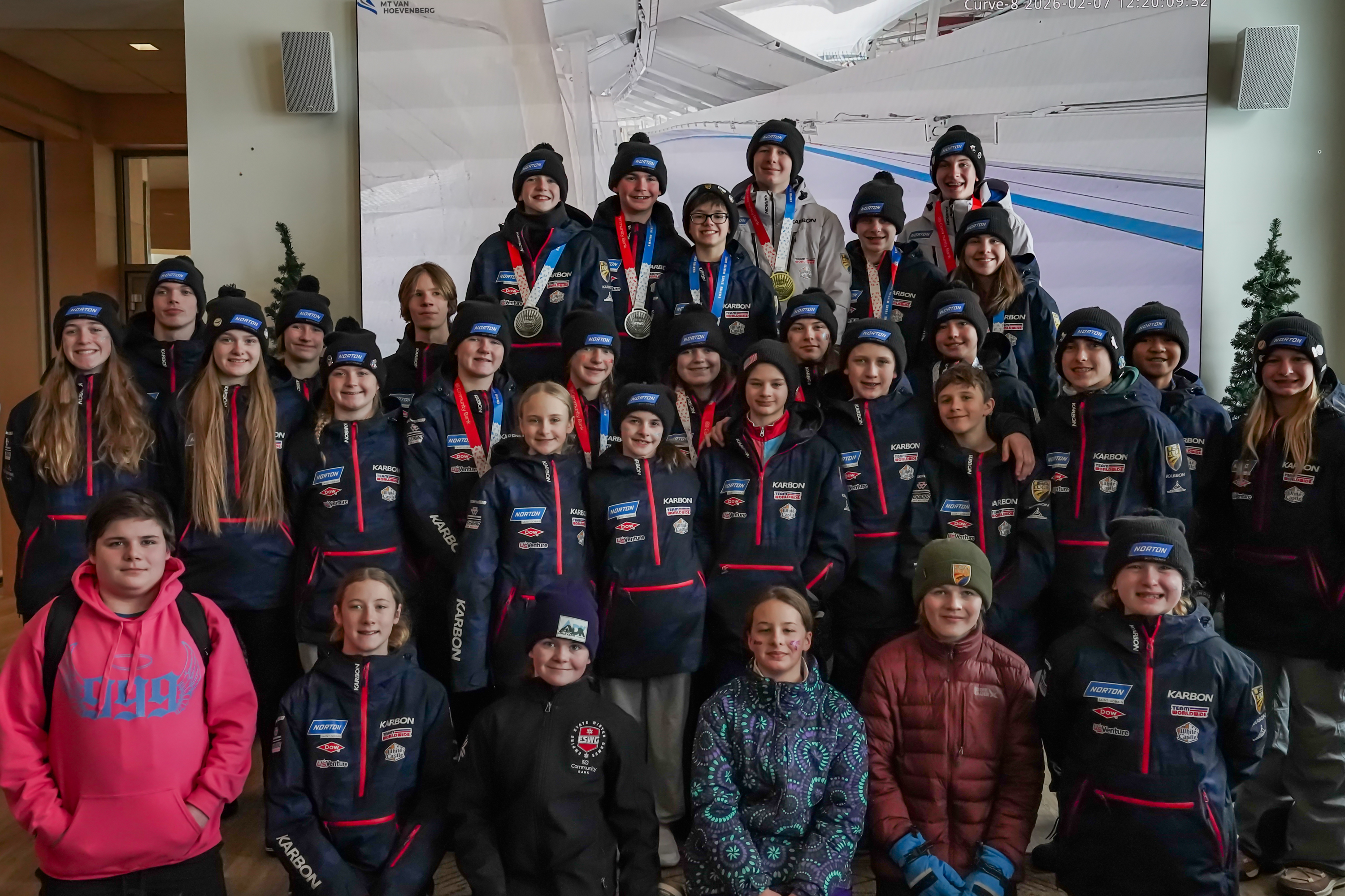February 7, 2026The luge competitors gather after the medal ceremony on Mt. Van Hoevenberg in Lake Placid, New York during the Empire State Winter Games on Saturday, Feb. 7, 2026. (Jack Henry / Newhouse School)