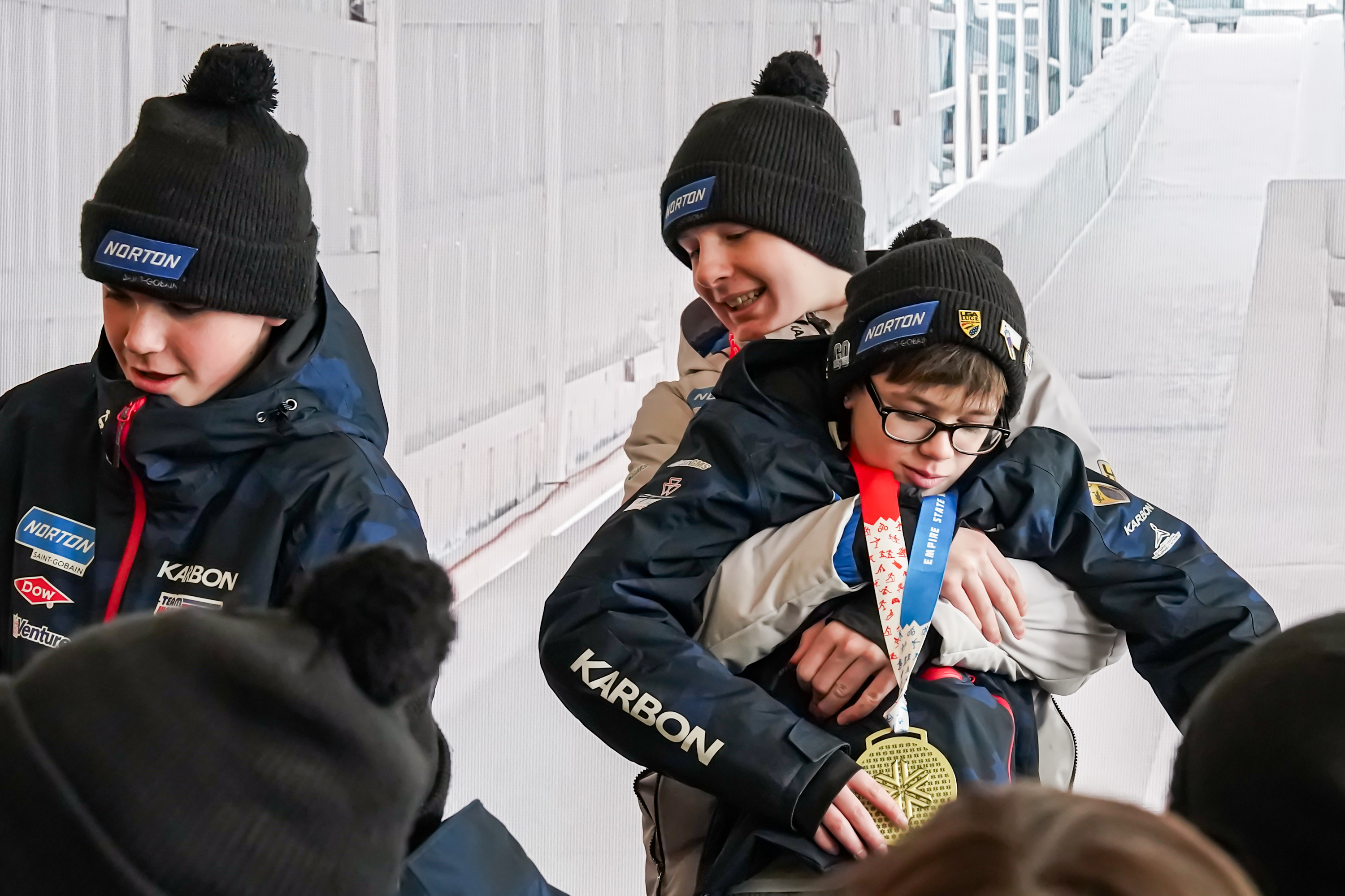 Luge medalist Camden Maher lifts up medalist Maxim Zayonc after the medal ceremony on Mt. Van Hoevenberg in Lake Placid, New York during the Empire State Winter Games on Saturday, Feb. 7, 2026. (Jack Henry / Newhouse School)
