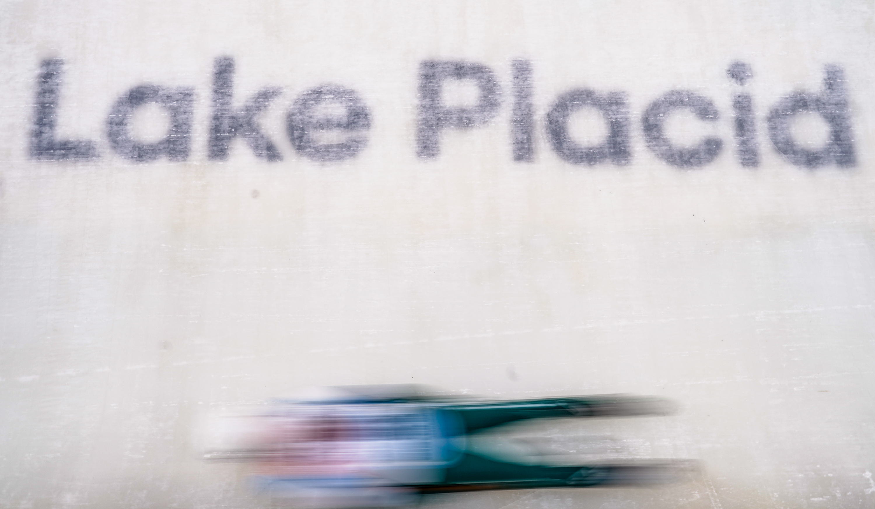 A luge competitor flies past the Lake Placid logo on Mt. Van Hoevenberg in Lake Placid, New York during the Empire State Winter Games on Saturday, Feb. 7, 2026. (Jack Henry / Newhouse School)