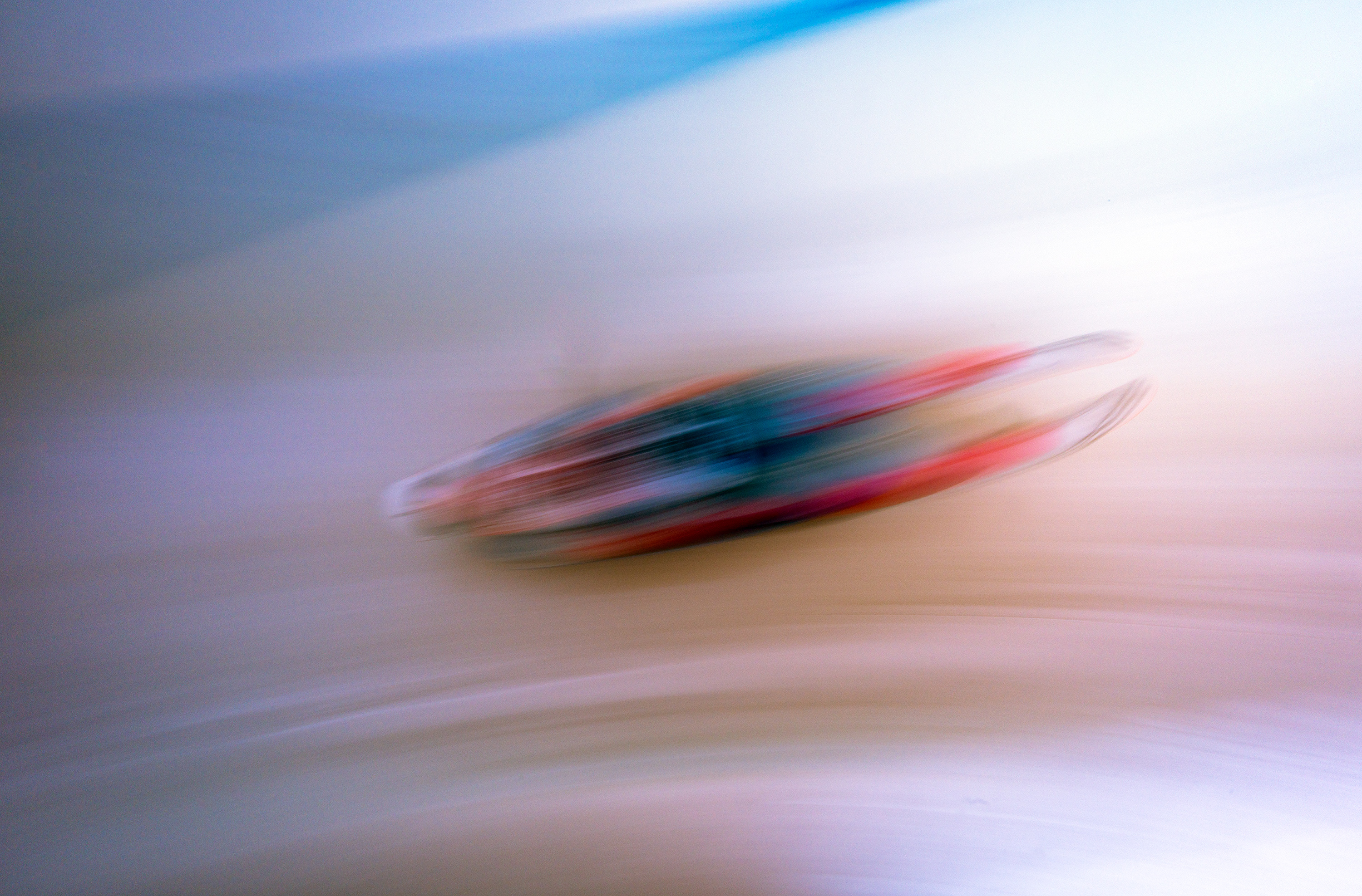 A competitor navigates the Mt. Van Hoevenberg Combined Bobsled, Luge, and Skeleton Track during the Luge event on the Mt. Van Hoevenberg Olympic Bobsled Run in Lake Placid, New York, for the 2026 Empire State Winter Games. Feb. 7, 2026. (Zach Ornitz/Syracuse University)