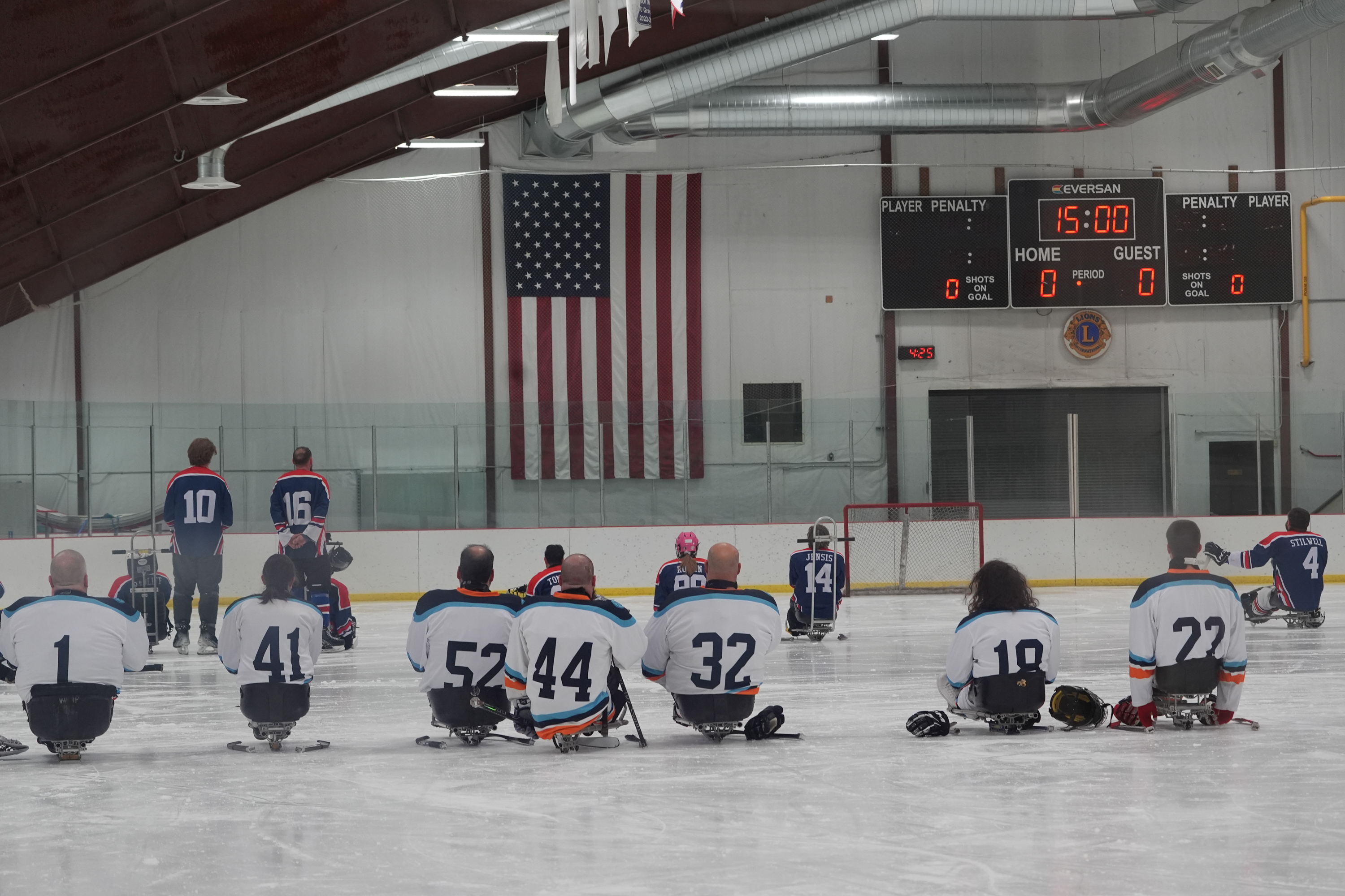 February 7, 2026The CNY Flyers and the Capital District Sled Warriors face the flag during The National Anthem as the teams face off at the 2026 Empire State Winter Games at the Tupper Lake Memorial Civic Center in Tupper Lake, New York, on Feb 6, 2026. (Rebecca Beckas/The Newhouse School)