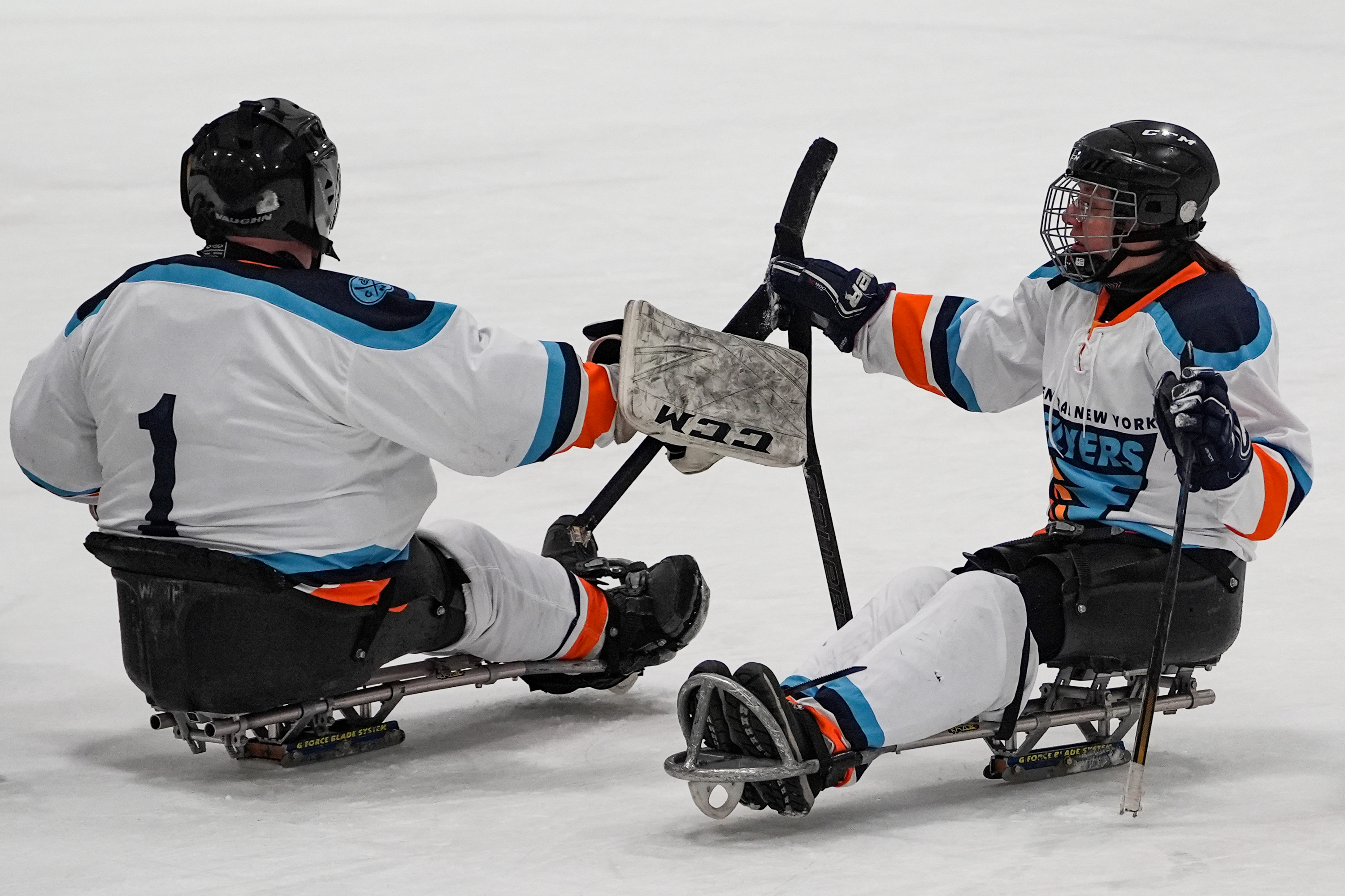 Two players of the CNY Flyers congratulate each other after scoring a goal against the Capital District Sled Warriors at the 2026 Empire State Winter Games at the Tupper Lake Memorial Civic Center in Tupper Lake, New York, on Feb 6, 2026. (Rebecca Beckas/The Newhouse School)