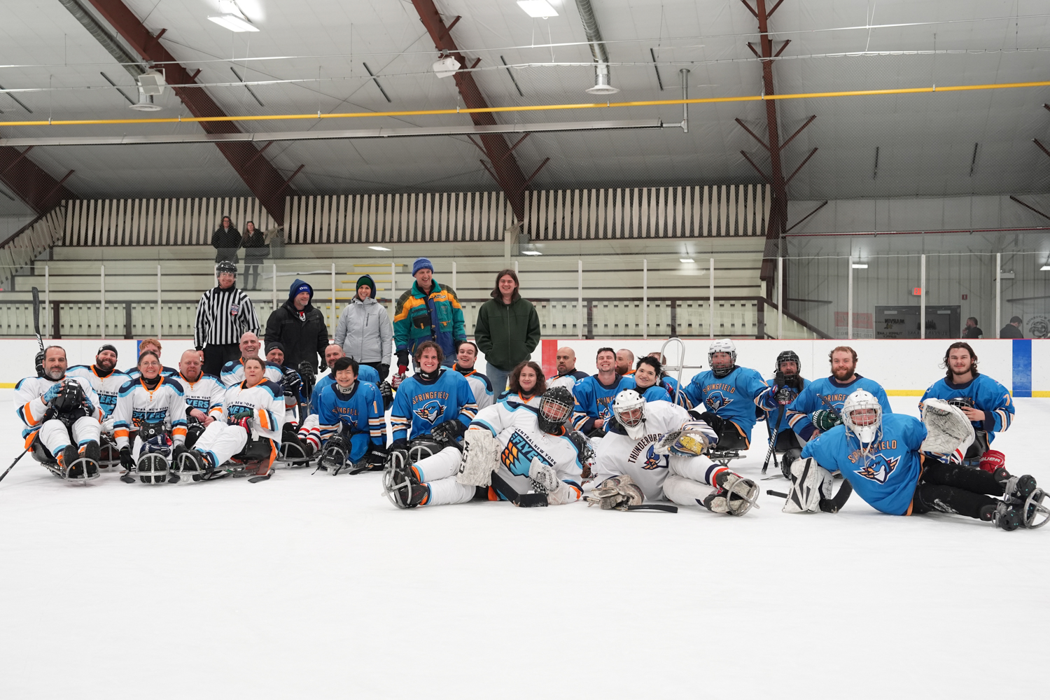 February 8, 2026The Central New York Flyers and Springfield Thunderbirds sled hockey teams pose for a group photo after their match at the Tupper Lake Civic Center during the Empire State Winter Games on Feb 7, 2026. (Adeline Taylor/ Newhouse School)