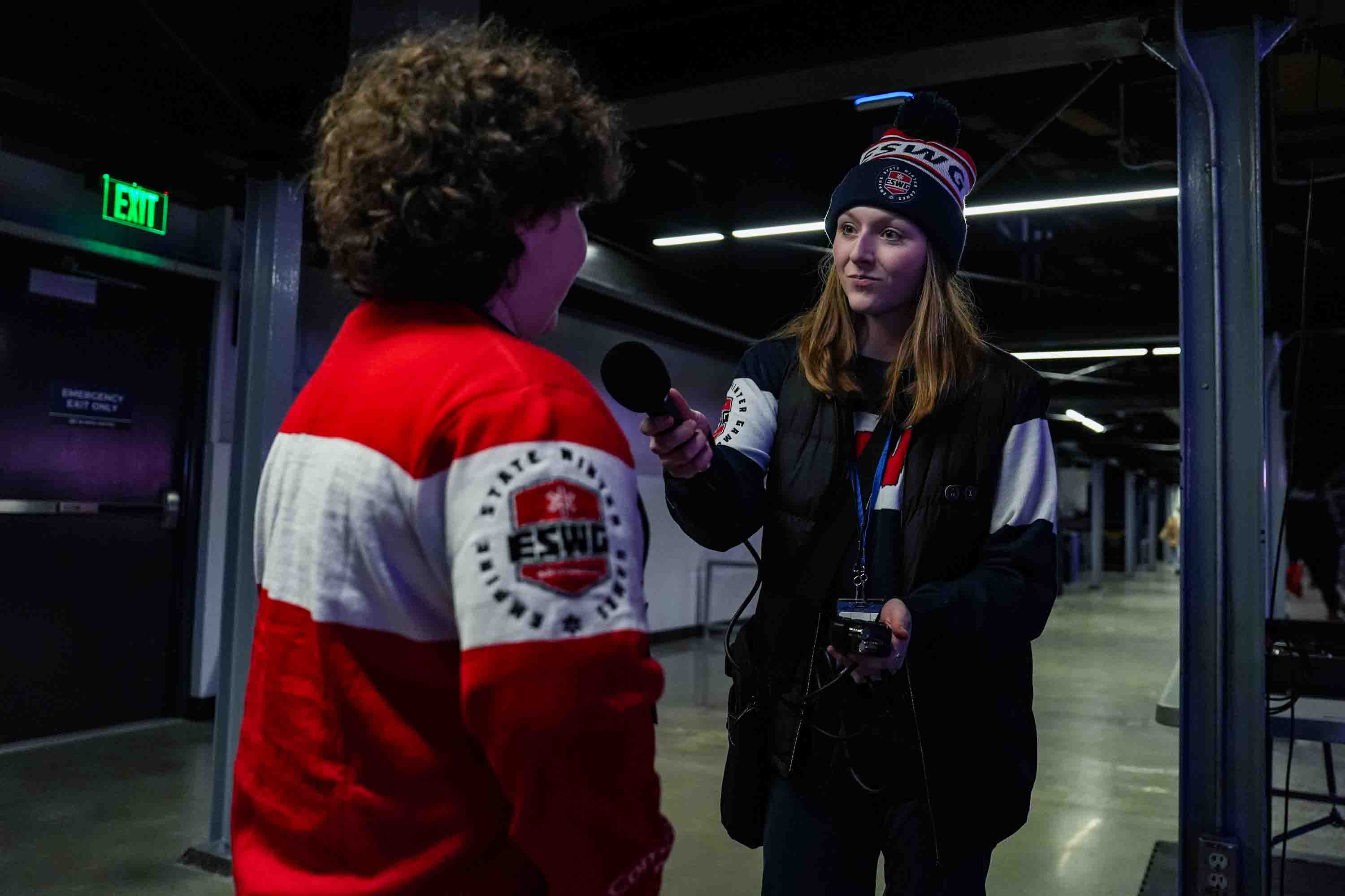February 7, 2026Radio producer Brooke Killgore interviews an athlete outside the 1980 Olympic Rink during the opening ceremonies of the Empire State Winter Games in Lake Placid, NY. Feb. 5, 2026. (Isaac Williams/The Newhouse School)