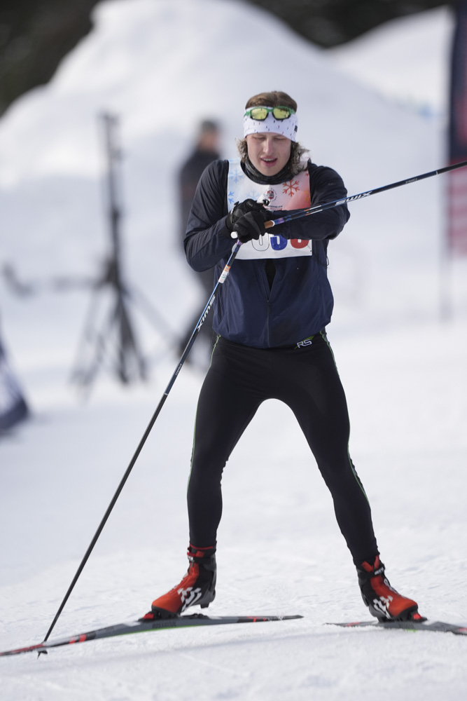 February 6, 2026Thomas Woods checks his watch as he gets going on his skis at Mount Van Hoevenberg in Lake Placid, New York, during the 2026 USA Winter Triathlon Championship. (Photo by Seth Gitner/The Newhouse School)
