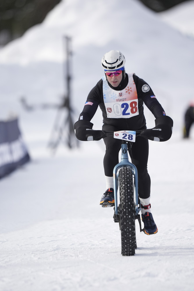 Cameron Schiller gets his bike going at Mount Van Hoevenberg in Lake Placid, New York, during the 2026 USA Winter Triathlon Championship. (Photo by Seth Gitner/The Newhouse School)
