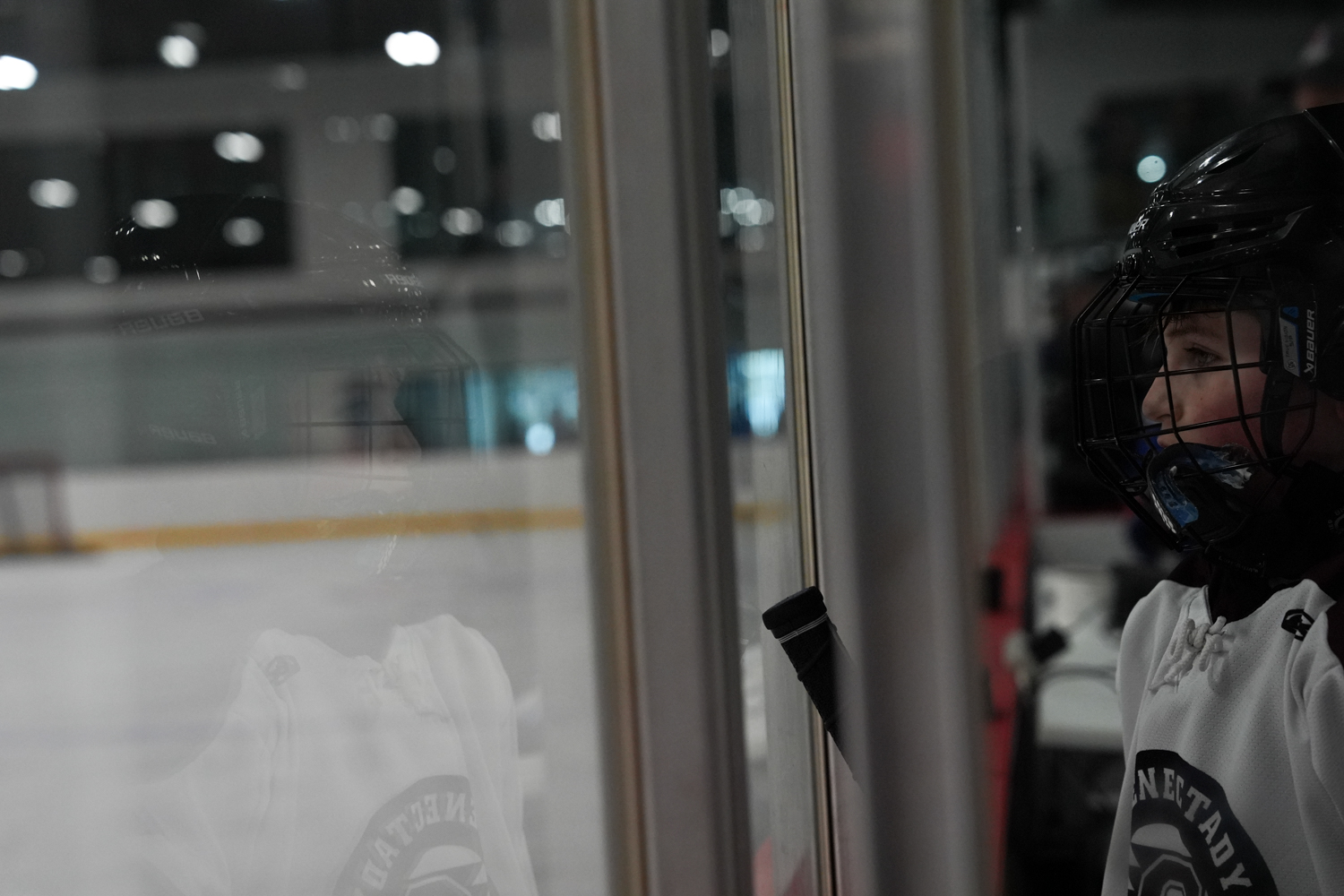 February 6, 2026Santino Girard watches the Schenectady Charger's game against the Watertown Wolves from the pentalty box in the Empire State Winter Games at the Saranac Lake Civic Center on February 5, 2026. (Adeline Taylor/ The Newhouse School)