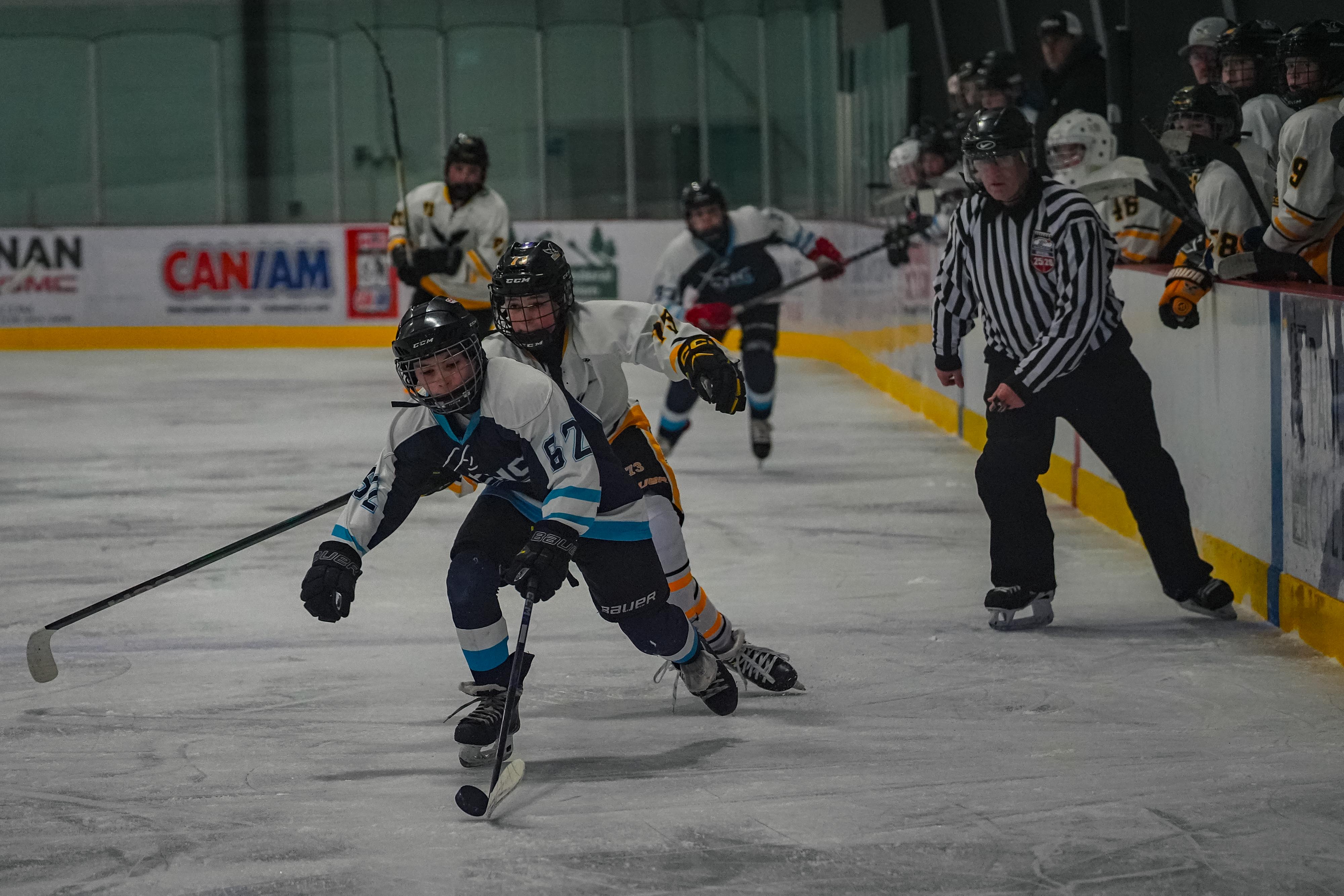 February 6, 2026#62 Caleb Cosamano fights for the puck as the New Hartford Spartans and the Valley Eagles face off at the Saranac Lake Civic Center for the Empire State Winter Games in Lake Placid, New York, on Feb 5, 2026 (Rebecca Beckas/The Newhouse School)