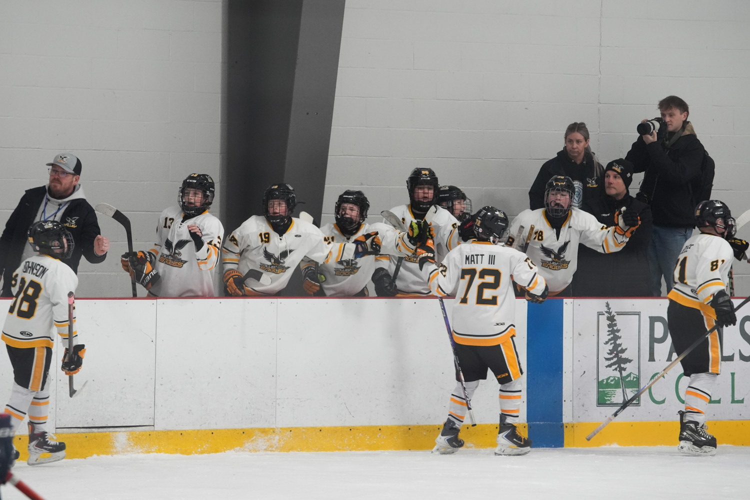 February 6, 2026The Valley Eagles Hockey Team celebrates a goal against the New Hartford Spartans in the Empire State Winter Games at the Saranac Lake Civic Center on Feb 5, 2026. (Adeline Taylor/ The Newhouse School)