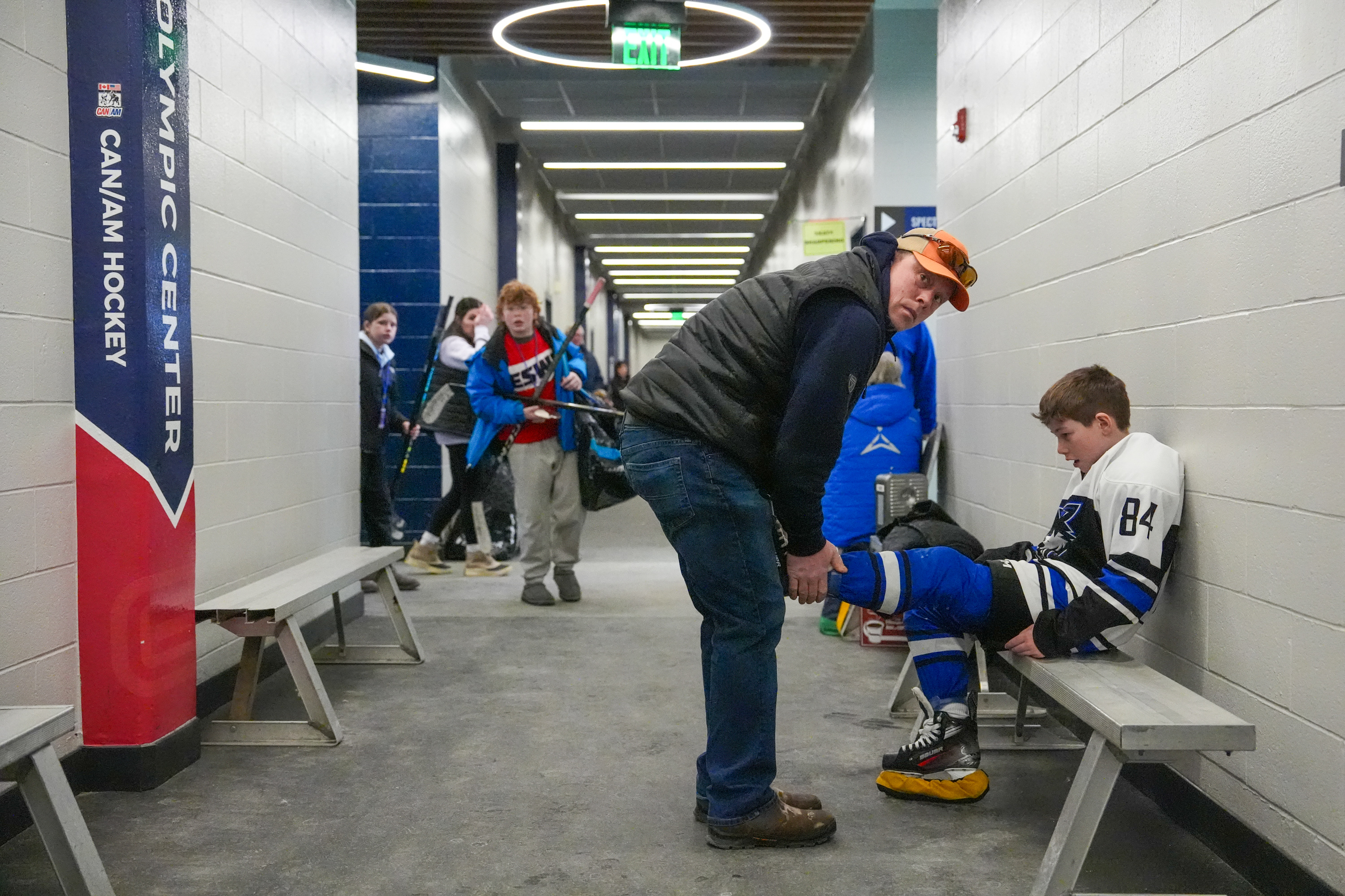 February 6, 2026A father helps his son with his skates before his hockey game on the USA rink in Lake Placid, New York, at the 2026 Empire State Winter Games. Feb 6, 2026. (Troy Conner/The Newhouse School)