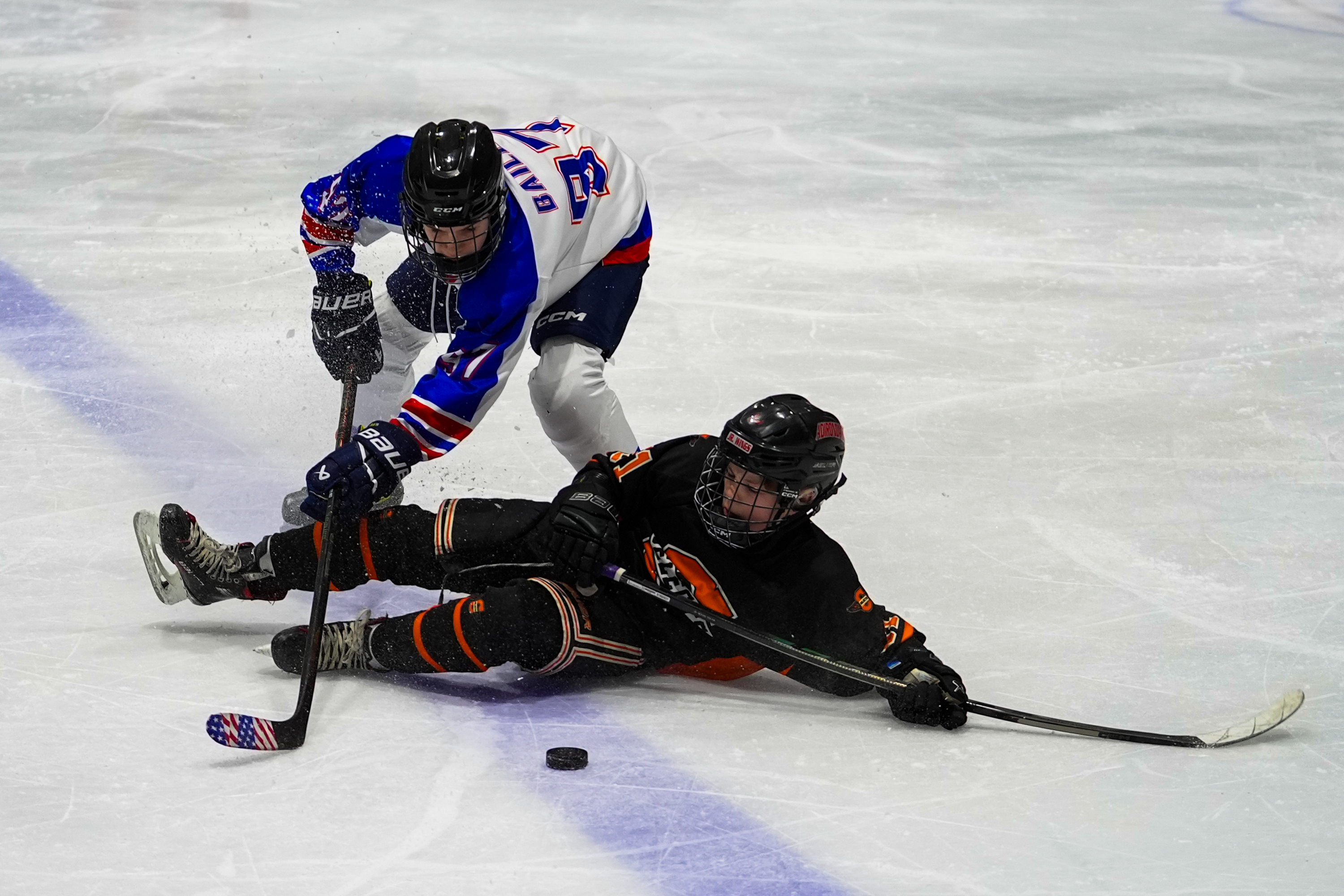 February 7, 2026Chazy Ice Hockey player Max Beauregard slides under New Hartford's Liam Bailey to secure the puck during the Empire State Winter Games at the USA Arena in the Olympic Center on Friday, February 6, in Lake Placid, New York. (Jack Henry / The Newhouse School)