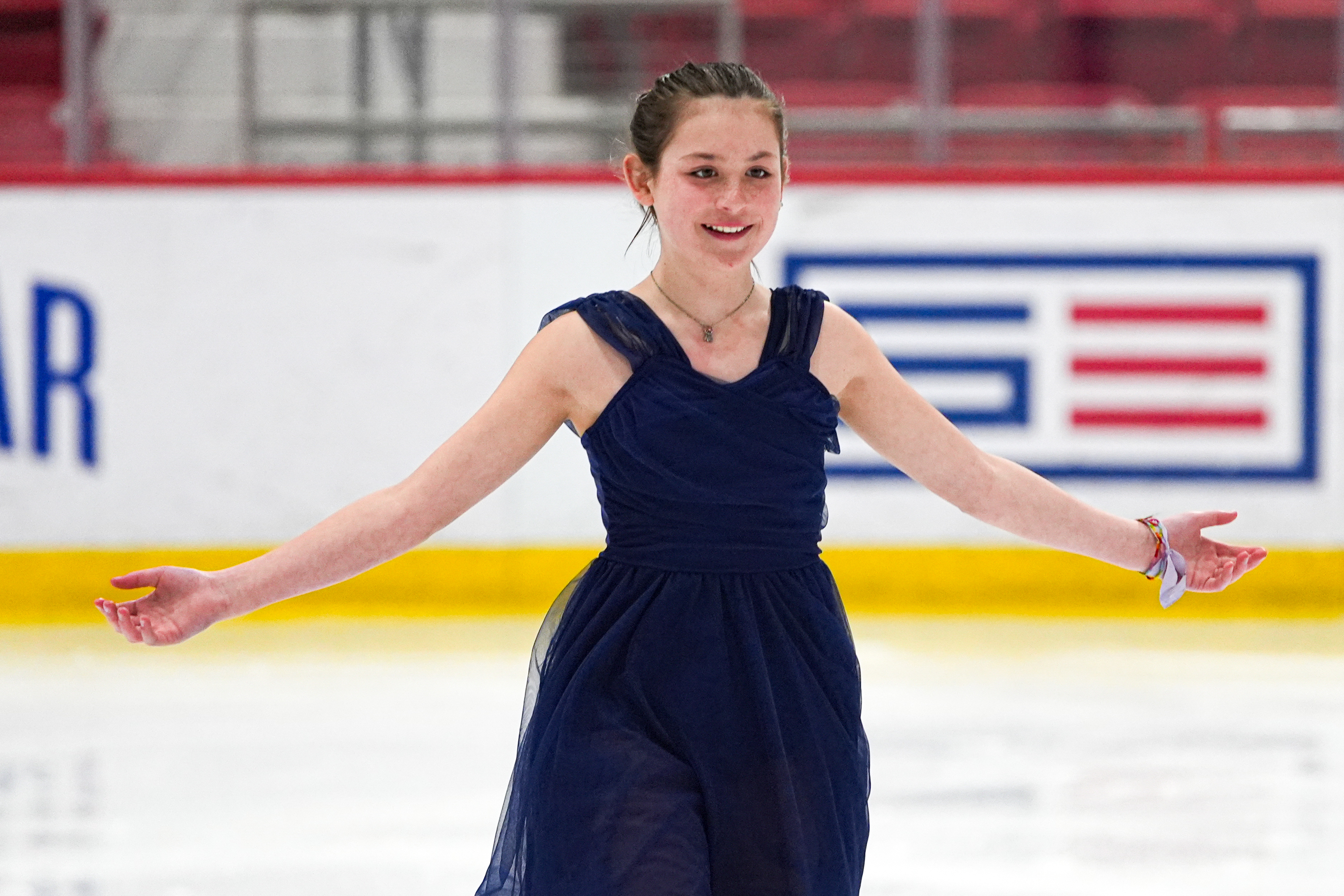 Figure skater Gabby Hudak smiles as she begins her routine at the 2026 Empire State Winter Games in the 1980 Rink at the Olympic Complex in Lake Placid, New York, on Feb. 7, 2026. (Isaac Williams/The Newhouse School)