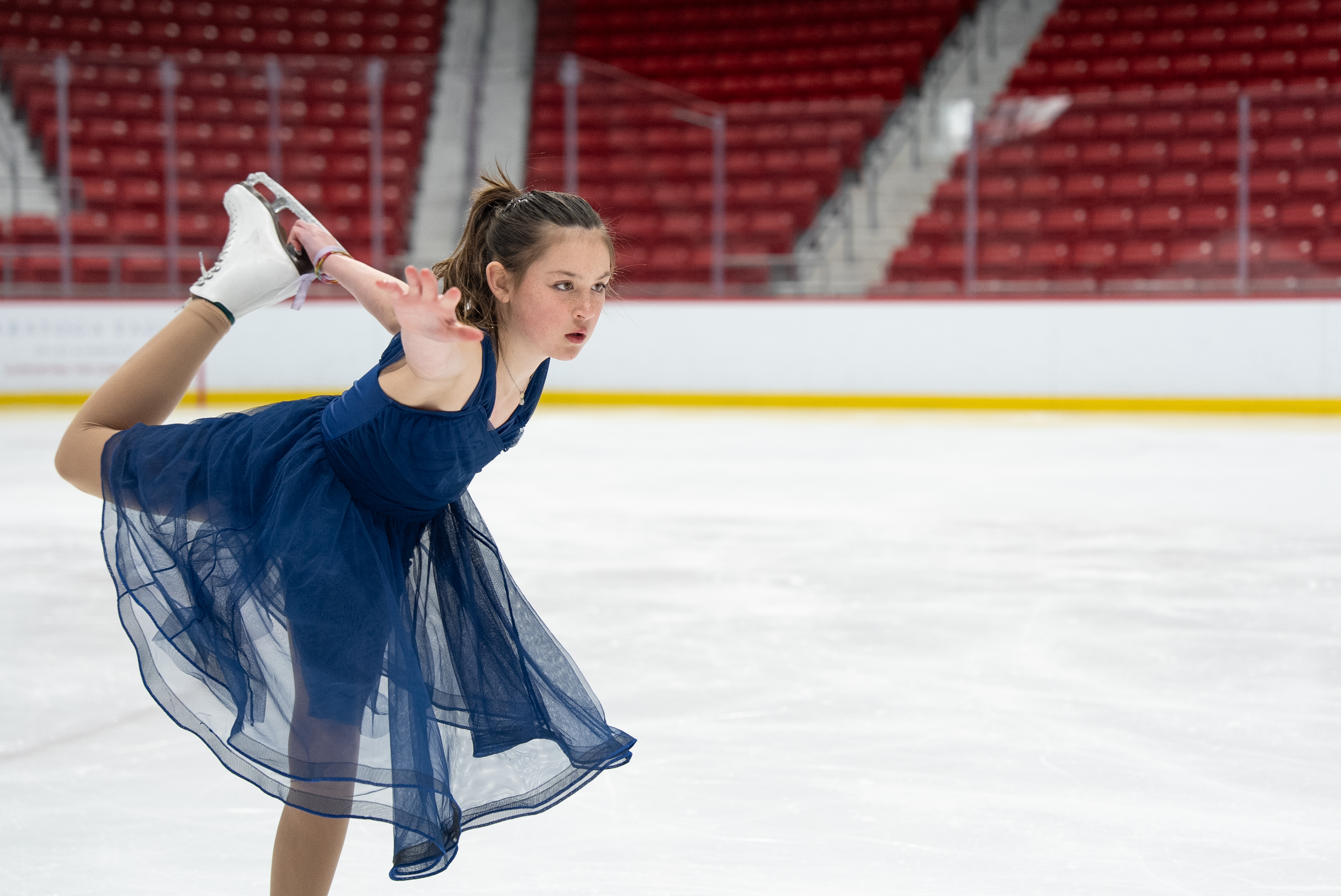 Amelia Salvadore from the Skating Club of Central New York does a catch-foot spiral during her figure skating routine on the 1980 Rink at Empire State Winter Games in Lake Placid, New York. Feb 7, 2026.