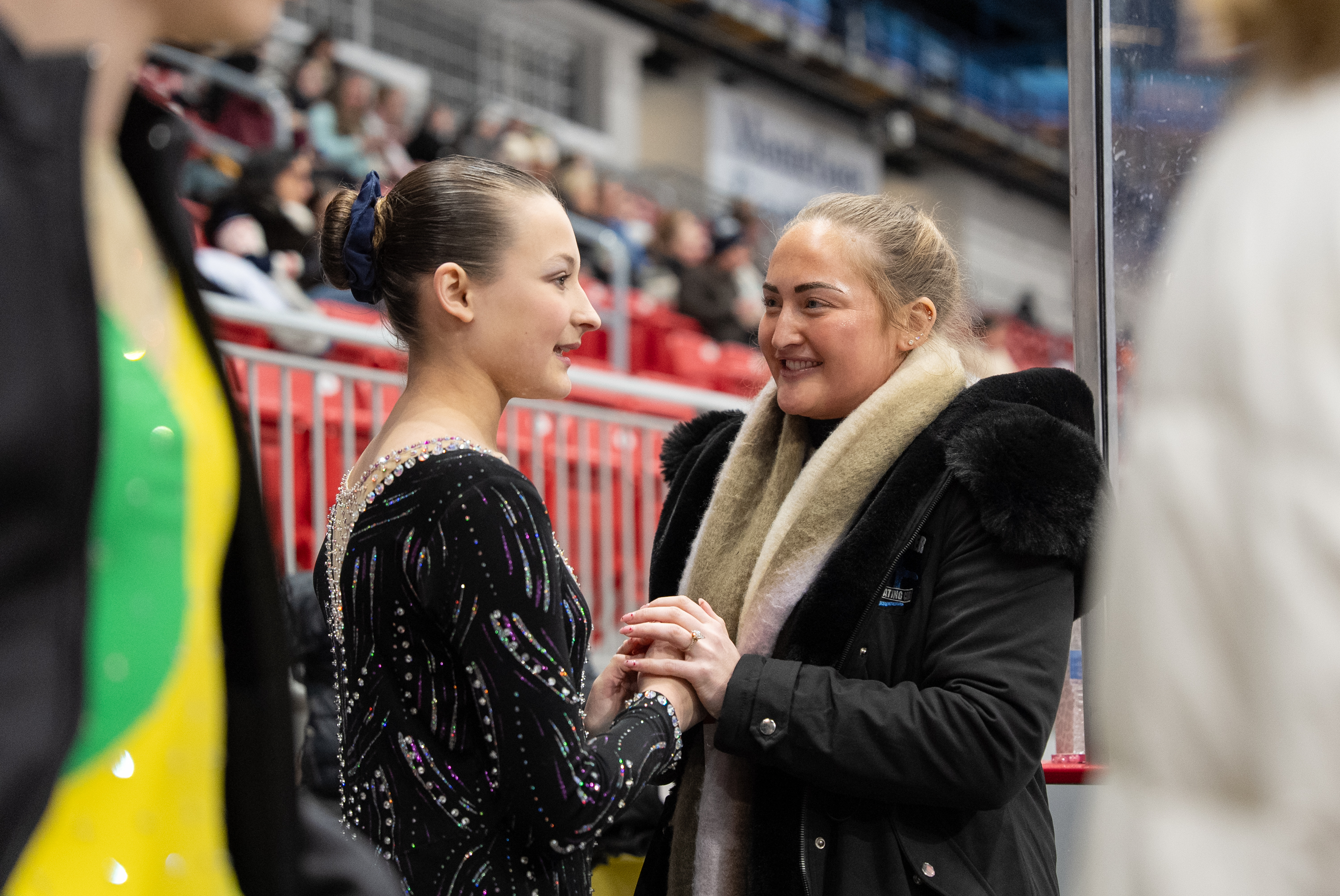 February 7, 2026Coach exchanges words of encouragement to her figure skater before her routine on the 1980 Rink during the Empire State Winter Games in Lake Placid, New York. Feb 7, 2026.