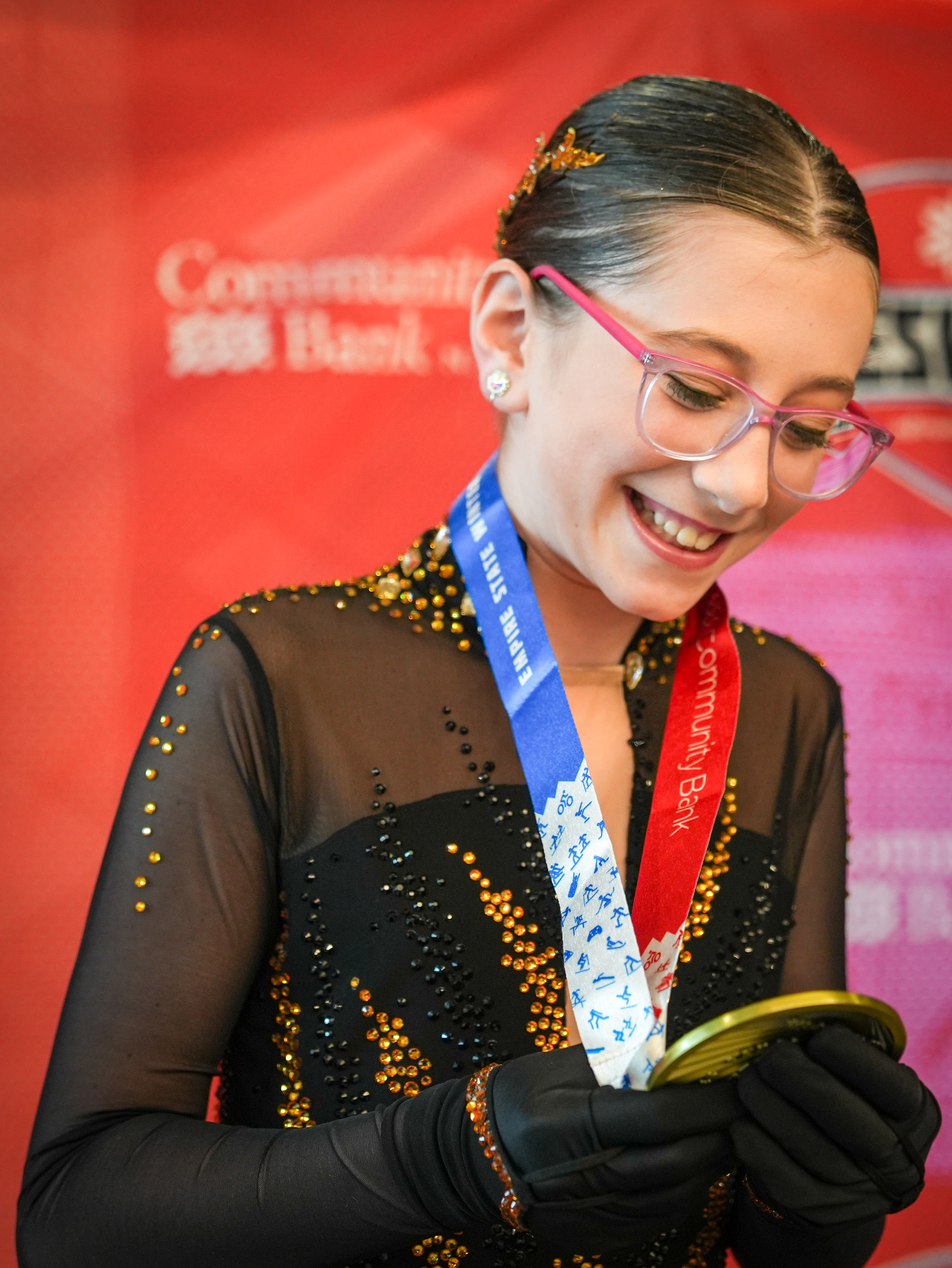 A skater admires her gold medal after winning her event at the 2026 Empire State Winter Games in the 1980 Rink at the Olympic Complex in Lake Placid, New York, on Feb. 7, 2026. (Rebecca Beckas/The Newhouse School)