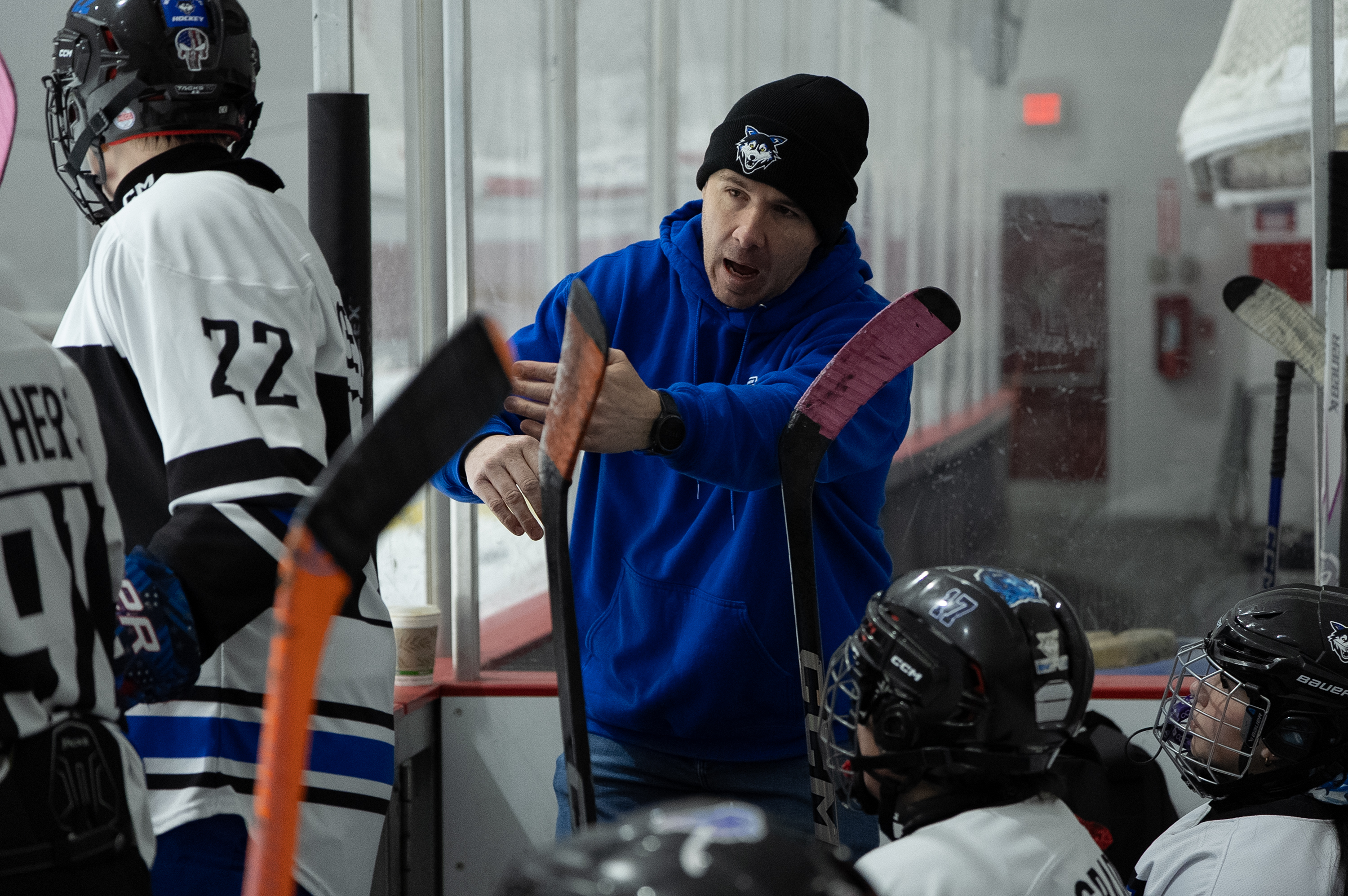 February 7, 2026Watertown Wolves Coach McCurry, advises his hockey team before they get back on the ice to play the Massena Jr. Raiders during the Empire State Winter Games. Lake Placid, New York. Feb 7, 2026.