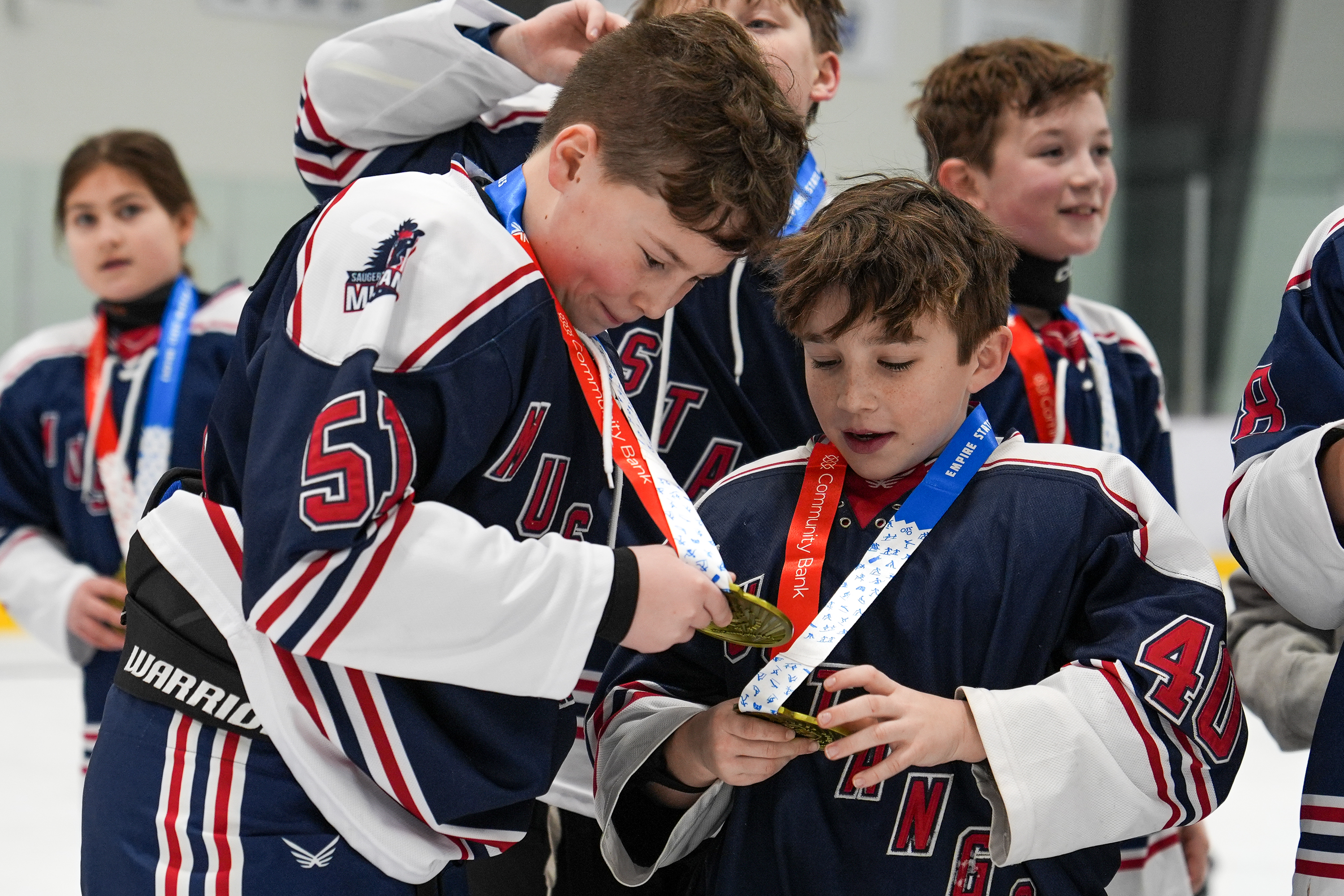 February 8, 2026Saugerties Mustangs players Liam Spooner and Ashton Signore admire their medals after the gold medal game on Feb. 8, 2026 at the Saranac Lake Civic Center in Saranac Lake, NY. (Isaac Williams/The Newhouse School)