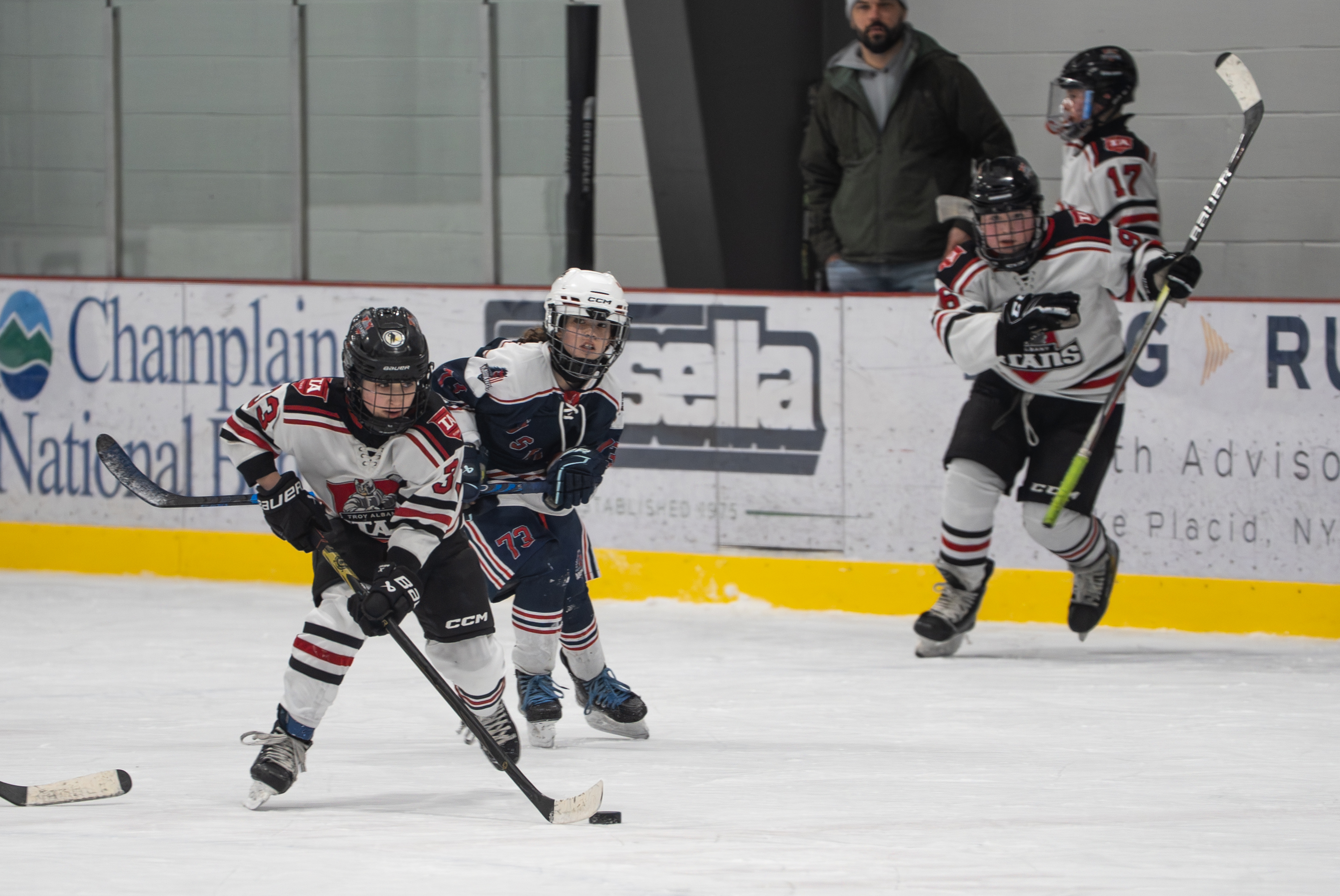 Troy Albany Titans forward Giovanni Apfel skates past Saugerties Mustangs defender in a late game situation during the gold medal game on Feb. 8, 2026 at the Saranac Lake Civic Center in Saranac Lake, NY. (Isaac Williams/The Newhouse School)