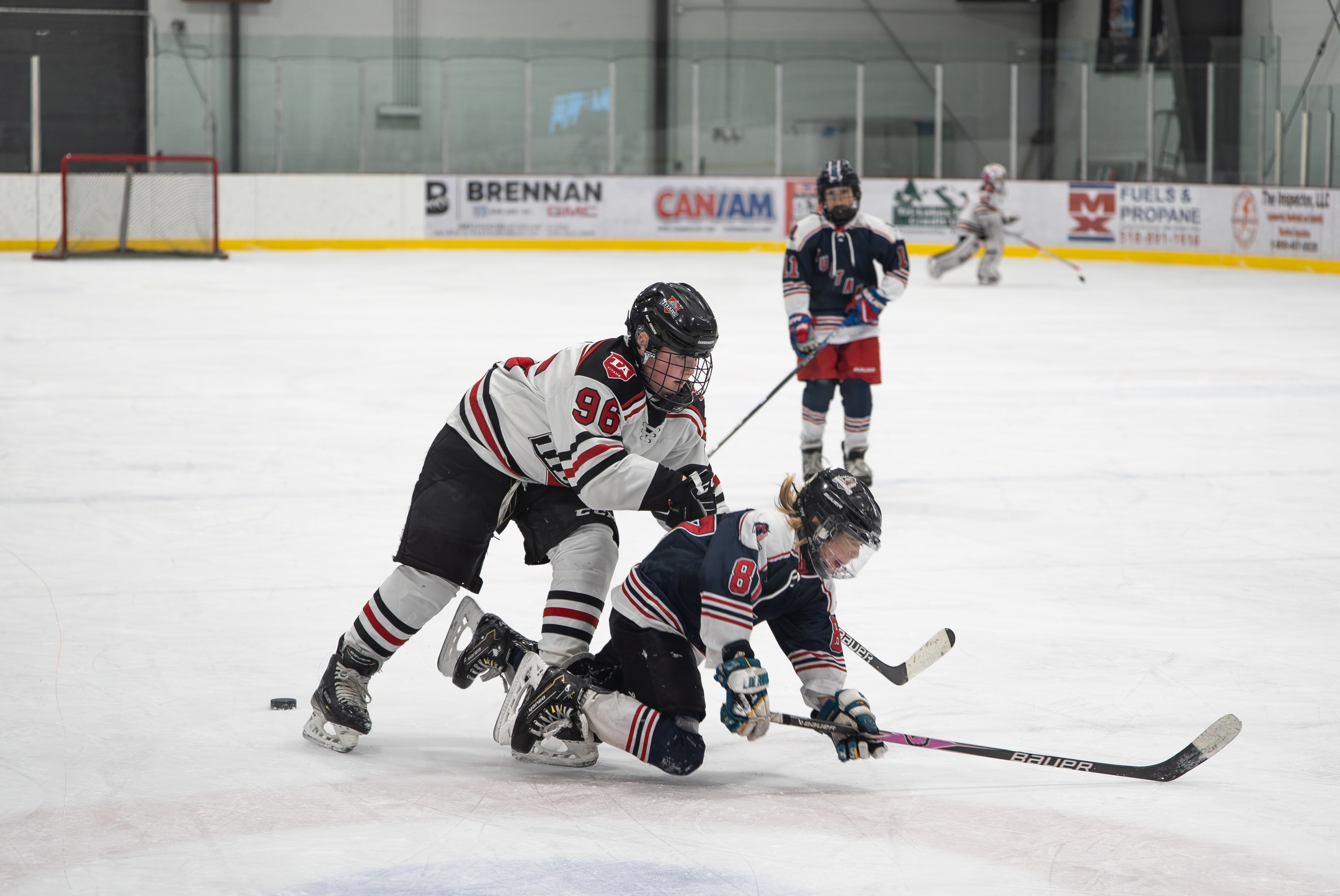 February 8, 2026Troy Albany Titans forward Theodore Reed cross checks Saugerties Mustangs defender Adam Merchant in a late game situation during the gold medal game on Feb. 8, 2026 at the Saranac Lake Civic Center in Saranac Lake, NY. (Isaac Williams/The Newhouse School)