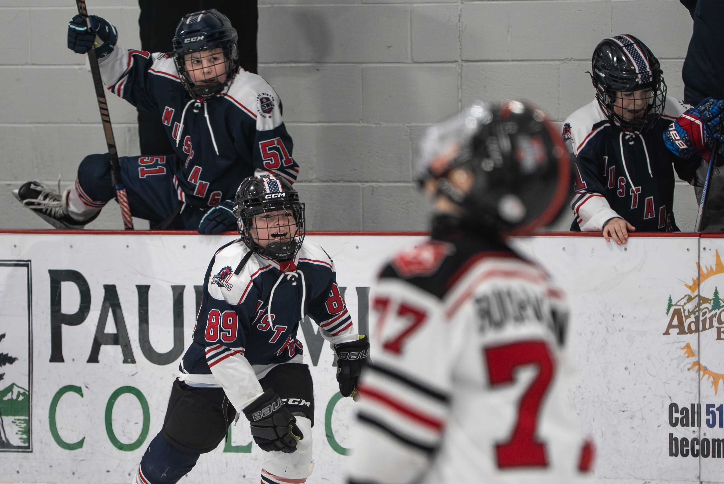 February 8, 2026Saugerties Mustangs player Dylan Emerick jumps off the bench to celebrate with his team during the gold medal game on Feb.8, 2026 at the Saranac Lake Civic Center in Saranac Lake, NY. (Isaac Williams/The Newhouse School)
