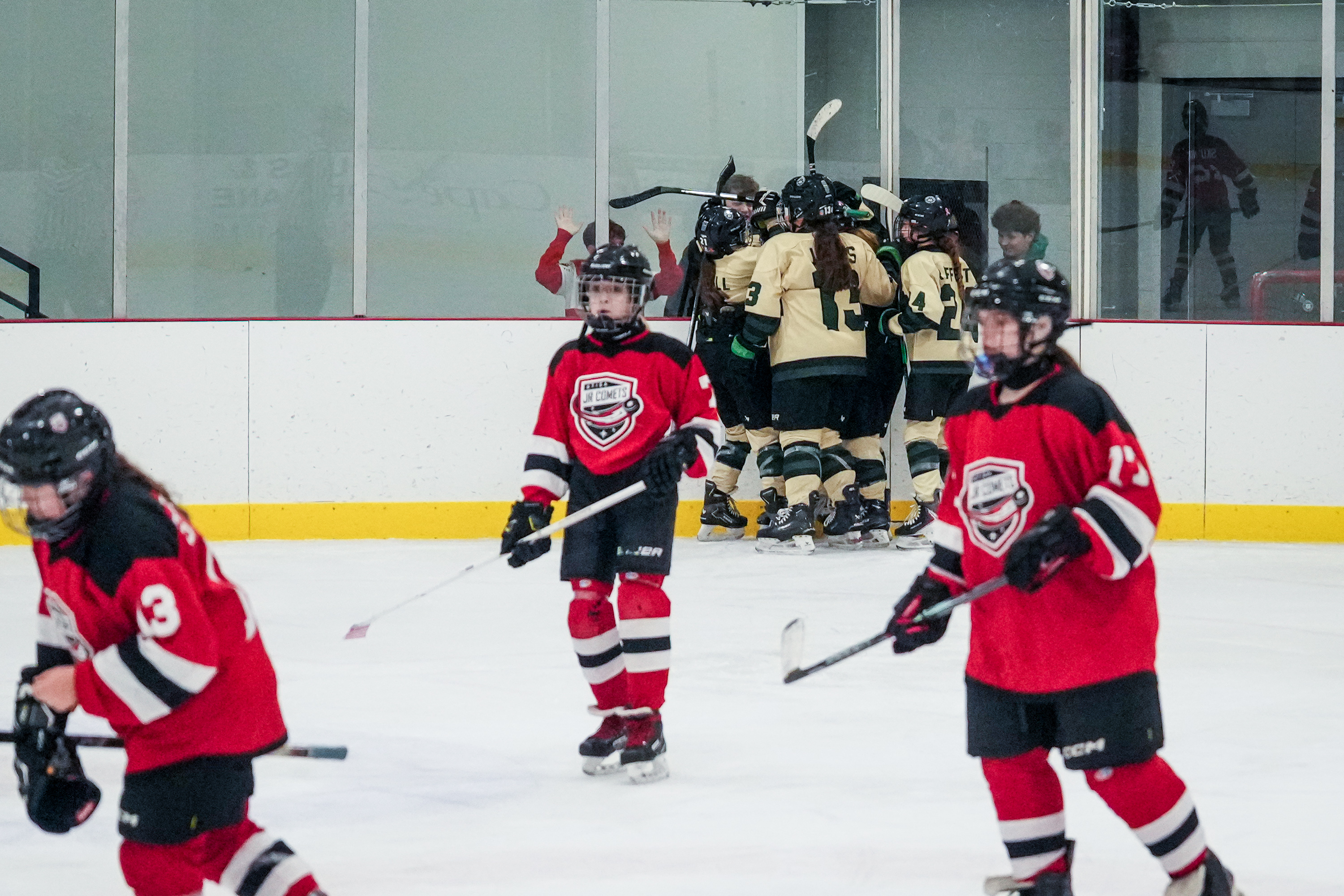 February 8, 2026The Adirondack 46ers celebrate after a goal agaisnt the Utica Jr. Comets at the Saranac Lake Civic Center on Feb. 8, 2026 in Saranac Lake, NY. (Collin Snyder/The Newhouse School)