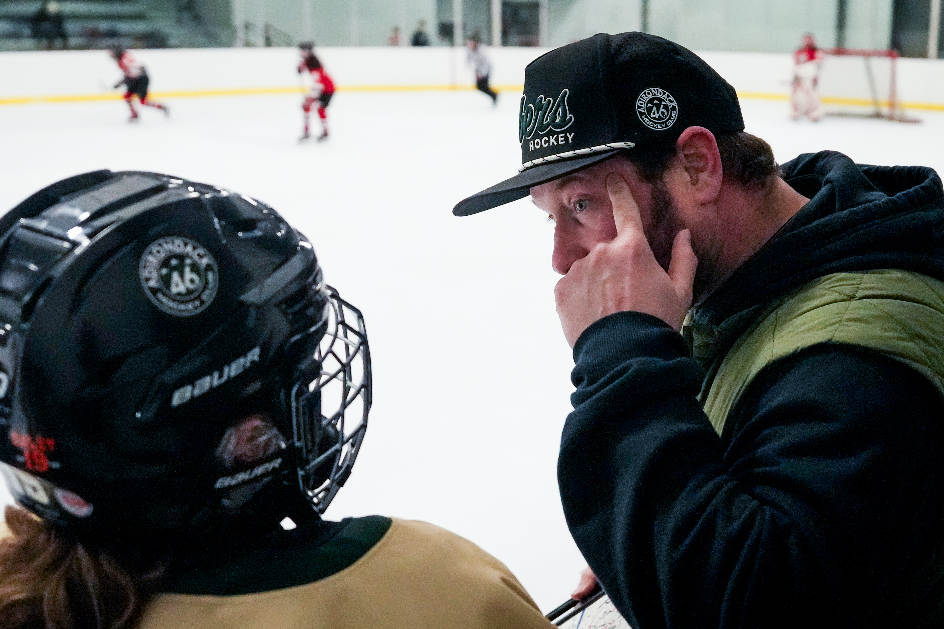 February 8, 2026Adirondack 46ers coach talks to Olivia Healey about her performance on the ice at the Saranac Lake Civic Center on Feb. 8, 2026 in Saranac Lake, NY. (Collin Snyder/The Newhouse School)