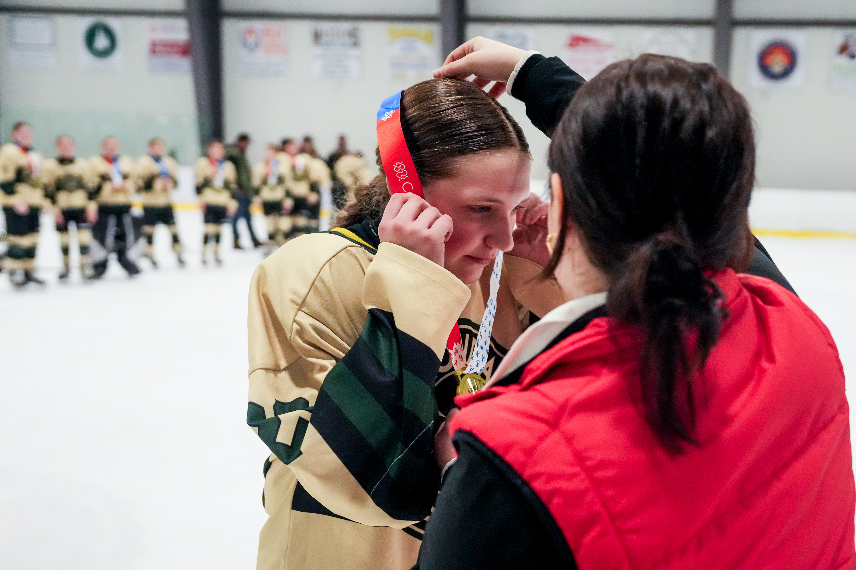 February 8, 2026Quinn Olson, Adirondack 46ers, recieves her medal after their championship victory at the Saranac Lake Civic Center on Feb. 8, 2026 in Saranac Lake, NY. (Collin Snyder/The Newhouse School)