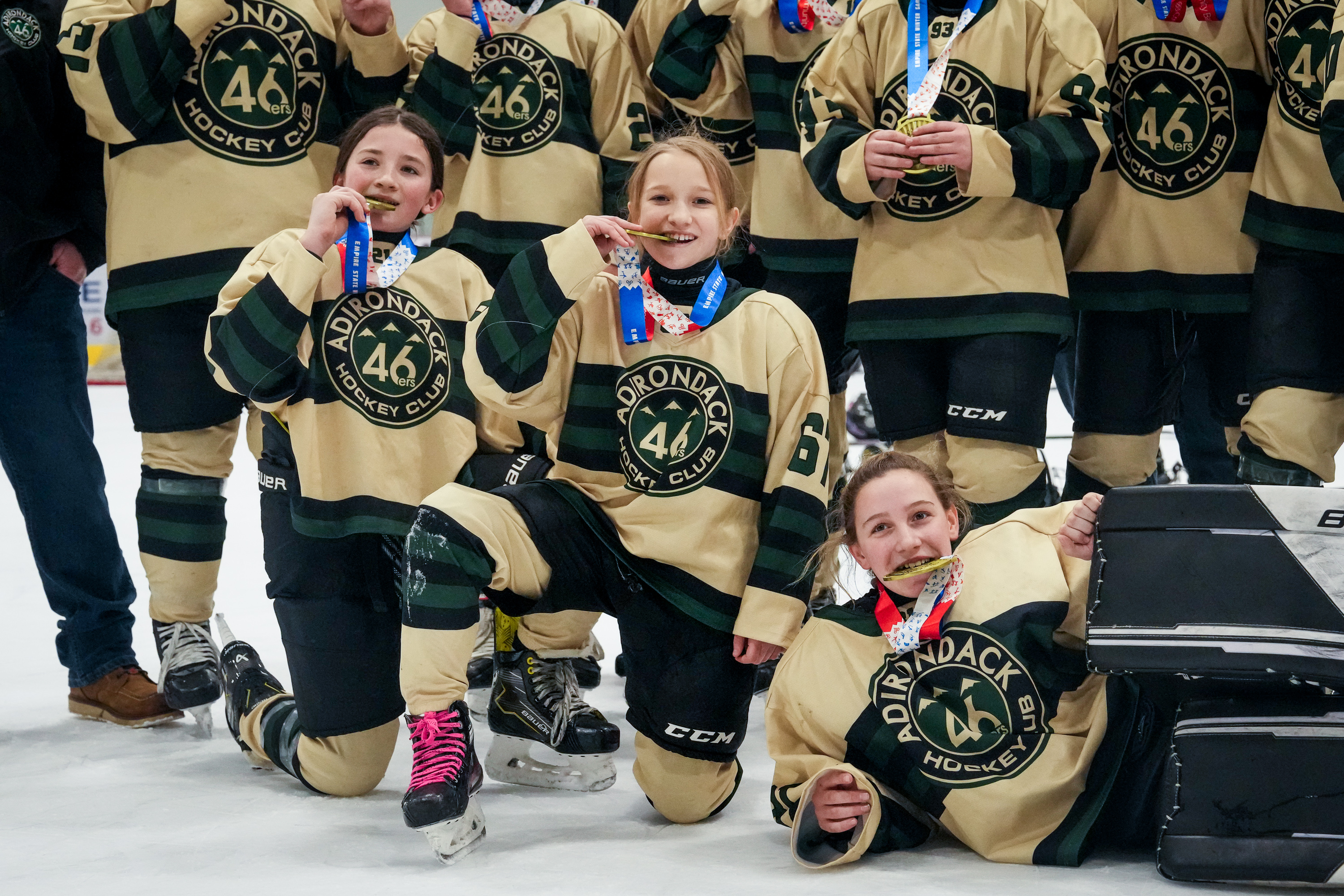 February 8, 2026The Adirondack 46ers pose after their championship victory at the Saranac Lake Civic Center on Feb. 8, 2026 in Saranac Lake, NY. (Collin Snyder/The Newhouse School)