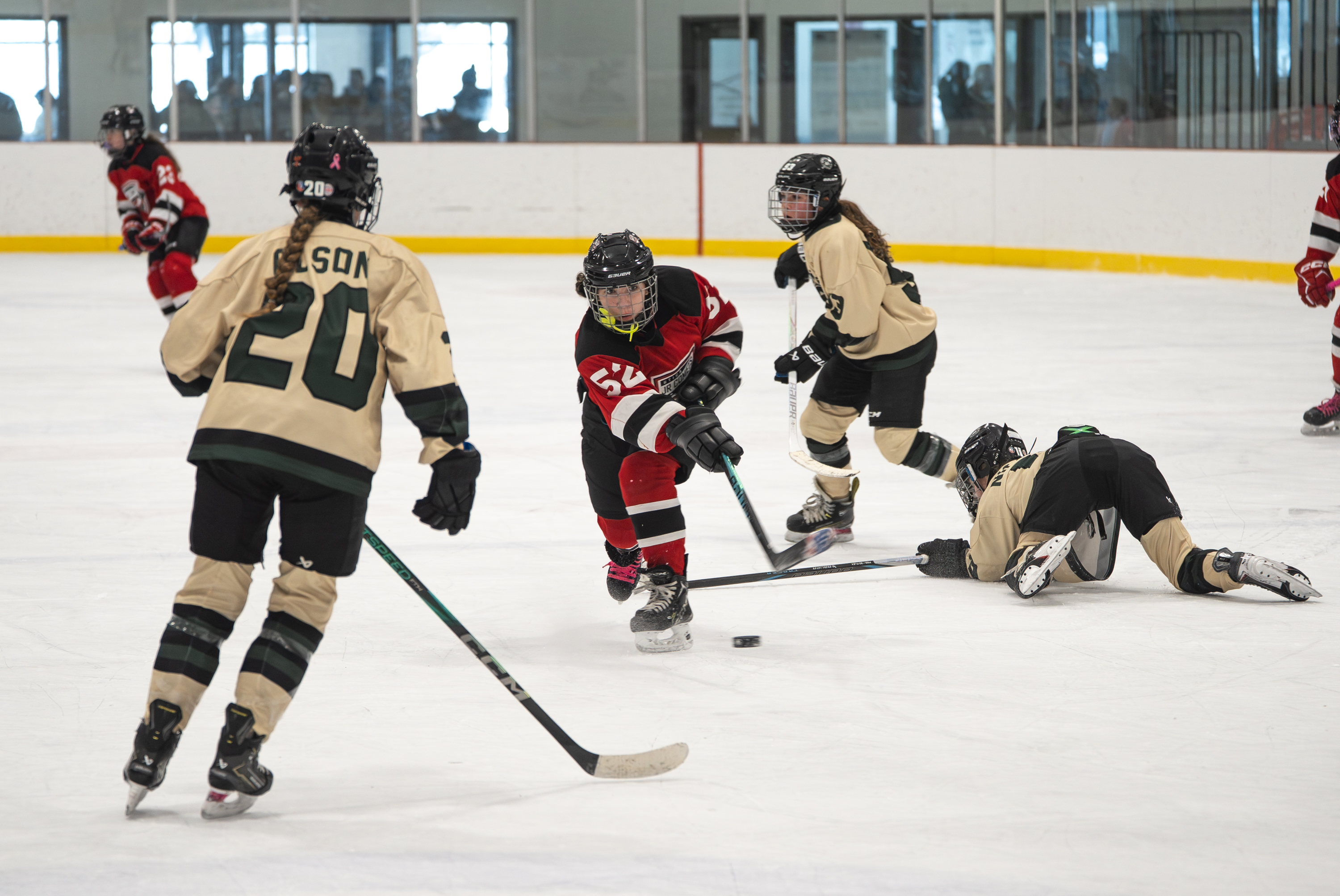 Utica Junior Comets forward Kaydence Gaffney takes a shot on goal vs Adirondack 46ers during the gold medal game on Feb. 8, 2026 at the Saranac Lake Civic Center in Saranac Lake, NY. (Isaac Williams/The Newhouse School)