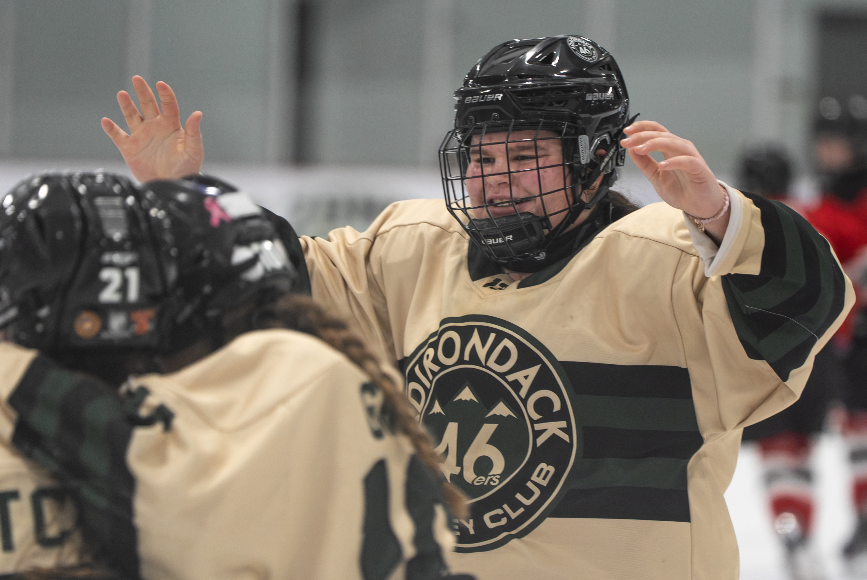 February 9, 2026Adirondack 46ers player goes in to hug her teammates after winning the the gold medal game on Feb. 8, 2026 at the Saranac Lake Civic Center in Saranac Lake, NY. (Isaac Williams/The Newhouse School)