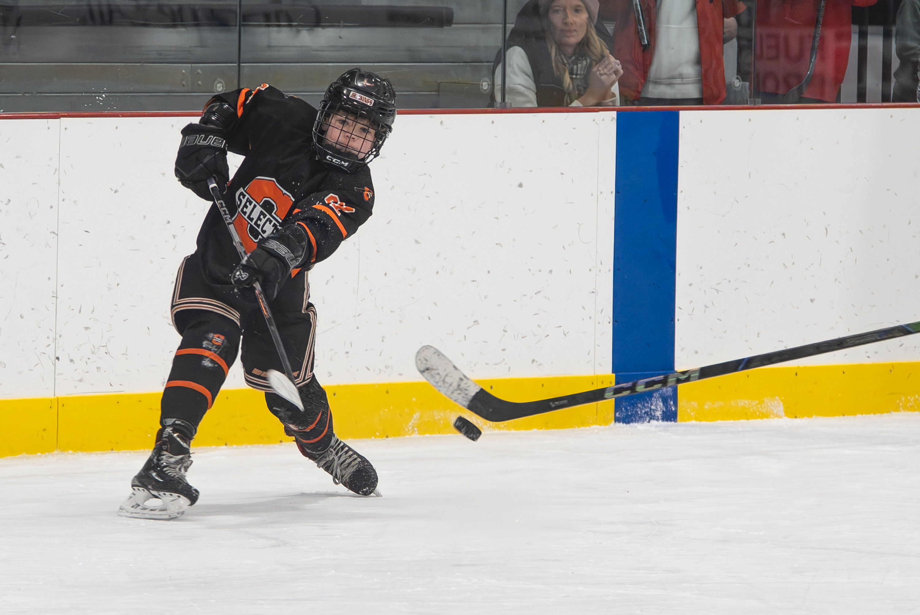 Chazy Selects defender takes a shot that is blocked by an errant stick during the gold medal game on Feb. 8, 2026 at the Saranac Lake Civic Center in Saranac Lake, NY. (Isaac Williams/The Newhouse School)