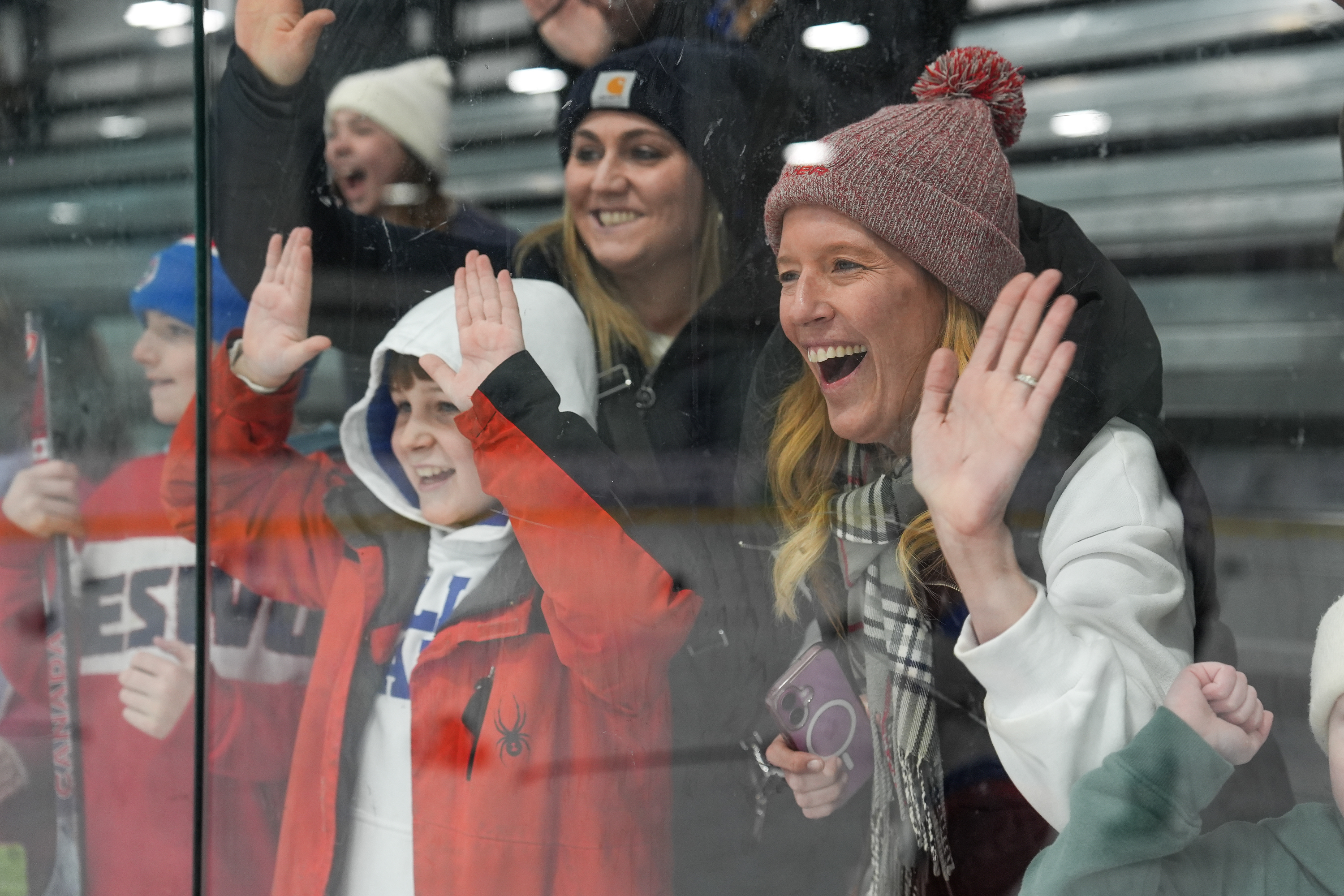 Supporters looks through the glass moments after New Hartford Hockey Club win against Chazy Selects at the gold medal game on Feb. 8, 2026 at the Saranac Lake Civic Center in Saranac Lake, NY. (Isaac Williams/The Newhouse School)